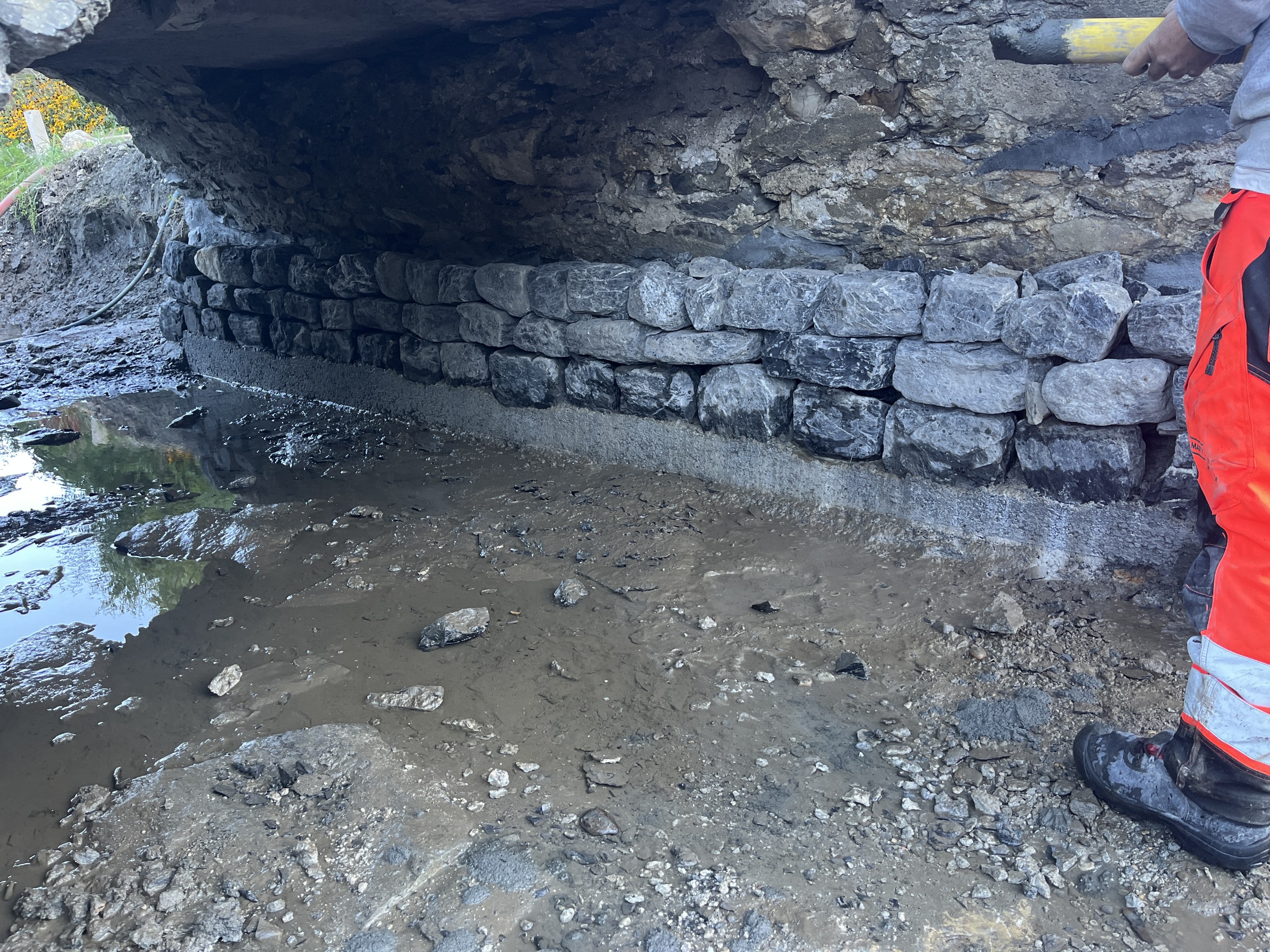 Die Neumülibrücke, eine rund 15m lange, zweifeldrige Natursteinbogenbrücke mit einer Bogenspannweite von 3m, wurde im Zuge der umfassenden Instandsetzungsmassnahmen in den Rheinauen Wartau saniert. Die Brücke zeigte erhebliche bauliche Mängel, insbesondere im Bereich der Widerlager und Flügelmauern, die eine vollständige Sanierung erforderlich machten. Im Zuge der Brückensanierung wurden die an der Brücke aufgehängten Werkleitungen in einem konventionellen Graben unterhalb der Bachsohle verlegt.
