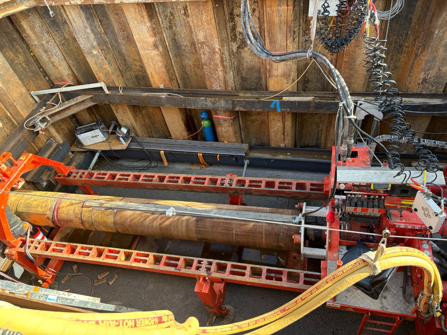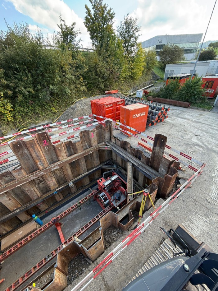 Im Rahmen des Projekts der RWT Regionalwerk Toggenburg AG wird in der Gemeinde Jonschwil ein rund 4,5 km langes Fernwärmenetz realisiert – ein wichtiger Schritt hin zu einer nachhaltigen und effizienten Energieversorgung in der Region. Für dieses Infrastrukturvorhaben führten wir einen anspruchsvollen Pressbohrvortrieb aus, welcher die sichere Querung einer Autostrasse sowie der Bahnlinie und eines Gewässers erforderte. Mit unserer Pressbohranlage konnten wir ein Stahlrohr DN 610 über 102 m bei leichtem Gefälle erfolgreich mit unserem System mit sehr hoher Genauigkeit und grosser Geschwindigkeit pressbohren. Die geologischen Bedingungen – insbesondere der kiesige Untergrund – stellten hohe Anforderungen an Präzision und Maschinentechnik. Durch den Einsatz unseres teilweise selbst entwickelten Systems des richtgesteuerten Pressbohrvortriebs mit Imlochhammer und Echtzeitvermessung wurde eine präzise Steuerung und maximale Sicherheit gewährleistet. In diesem Untergrund erreichen wir mit dieser Maschine eine neue Bestmarke. Die Arbeiten erfolgten in enger Abstimmung mit der Bauherrschaft und den Fachplanern sowie unter sorgfältiger Berücksichtigung aller örtlichen Gegebenheiten, bestehenden Werkleitungen und geologischen Randbedingungen.