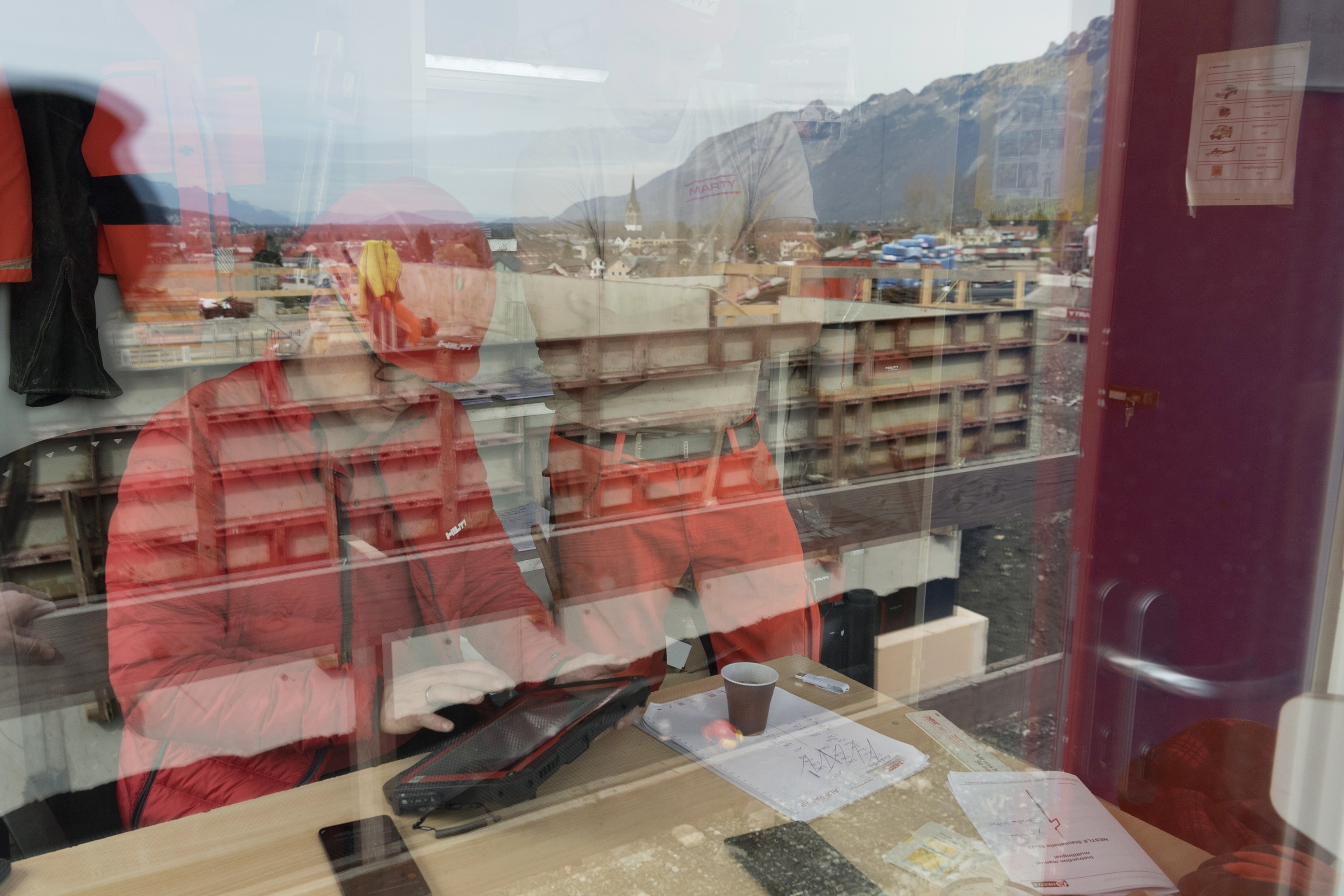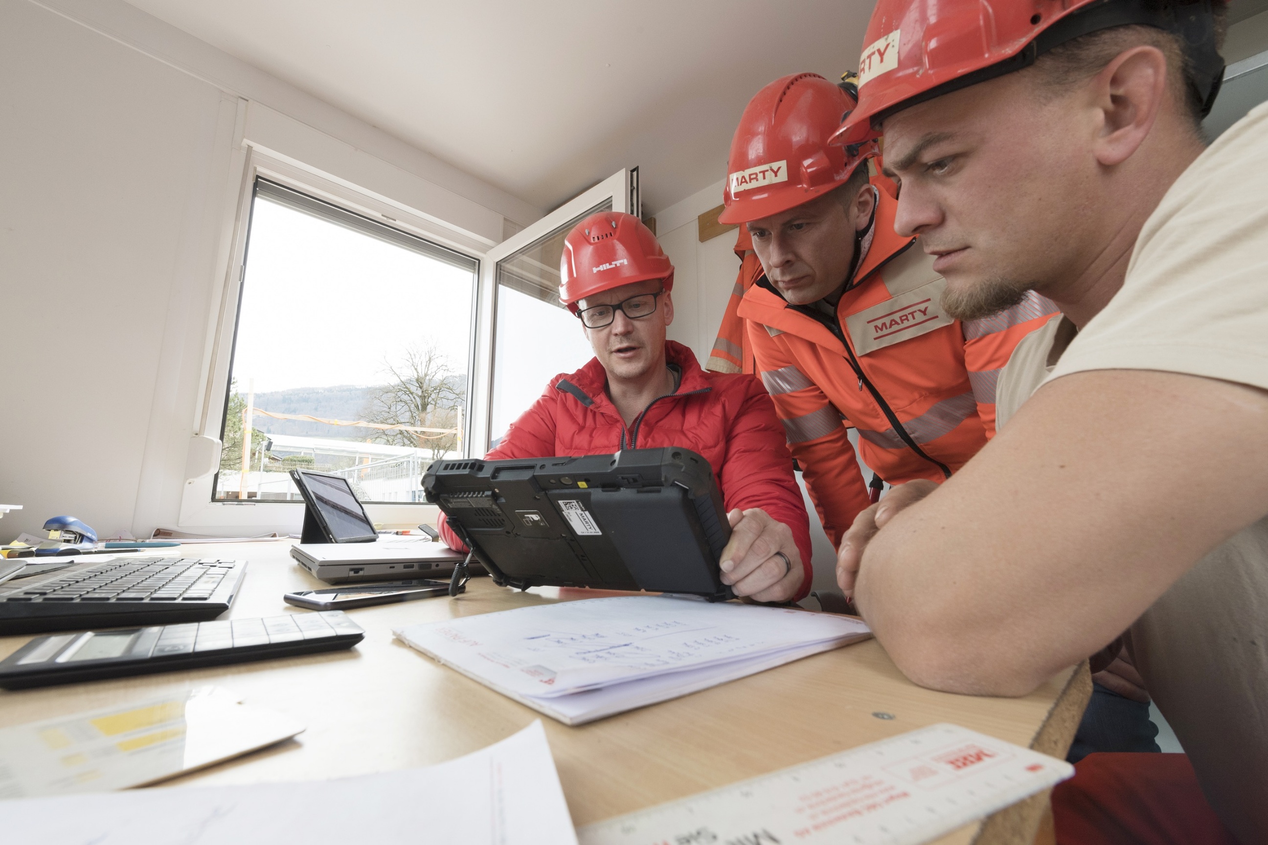 Im Mannschaftscontainer warten bereits Polier Fabian Weibel sowie Bauführer Patrick Hardegger auf ihn. Beides erfahrene Experten, wenn es um den Hochbau geht und seit vielen Jahren bei MARTY. Auch sie sind von der bisherigen Zusammenarbeit begeistert. «Unsere Anregungen und Verbesserungsvorschläge sind keine zwei Wochen später bereits in die Software integriert und anwendbar», staunt Patrick Hardegger, während Florian Köppel auf dem Tablet die Neuerungen erklärt und vorführt.