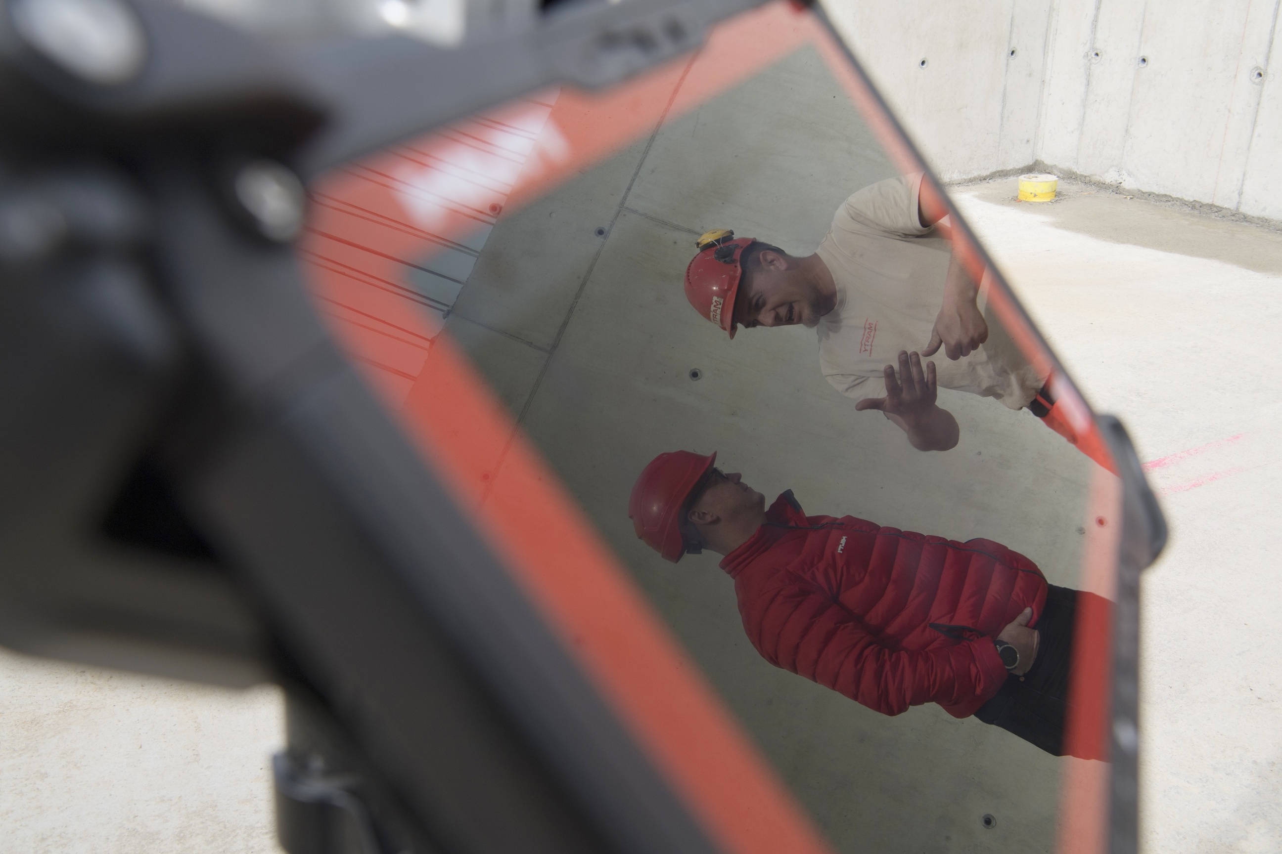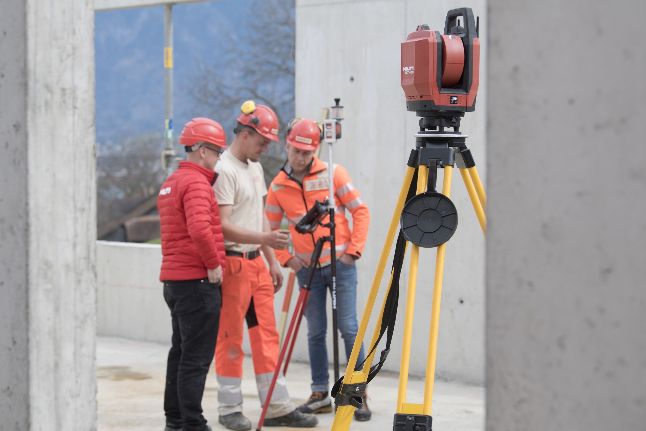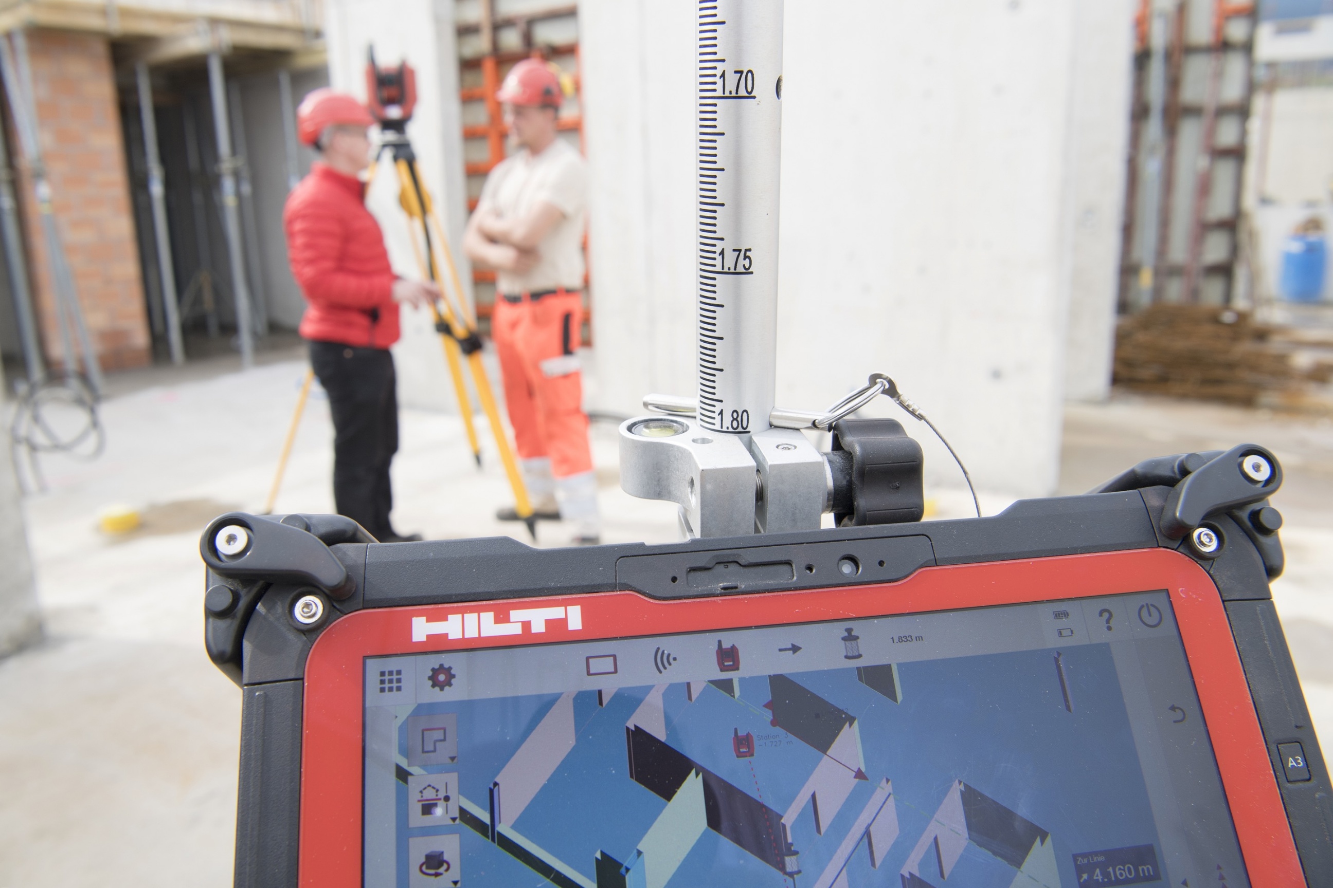Mittlerweile ist die Einführung im Mannschaftscontainer zu Ende. Polier Fabian Weibel drängt darauf, die Software-Updates auf der Baustelle auszuprobieren. Er öffnet den roten HILTI-Koffer und greift nach der Totalstation PLT 400: ein vielseitig verwendbares, sich selbst kalibrierendes Vermessungsgerät, von dem die unterschiedlichsten Daten und Messergebnisse direkt auf das handliche Tablet übertragen werden können. Er montiert das Präzisionsmessgerät mit wenigen Handgriffen auf ein grosses, gelbes Stativ und das Tablet samt Prisma-Empfangsgerät, das mittels Laser angesteuert wird, auf ein kleineres Dreibein.
