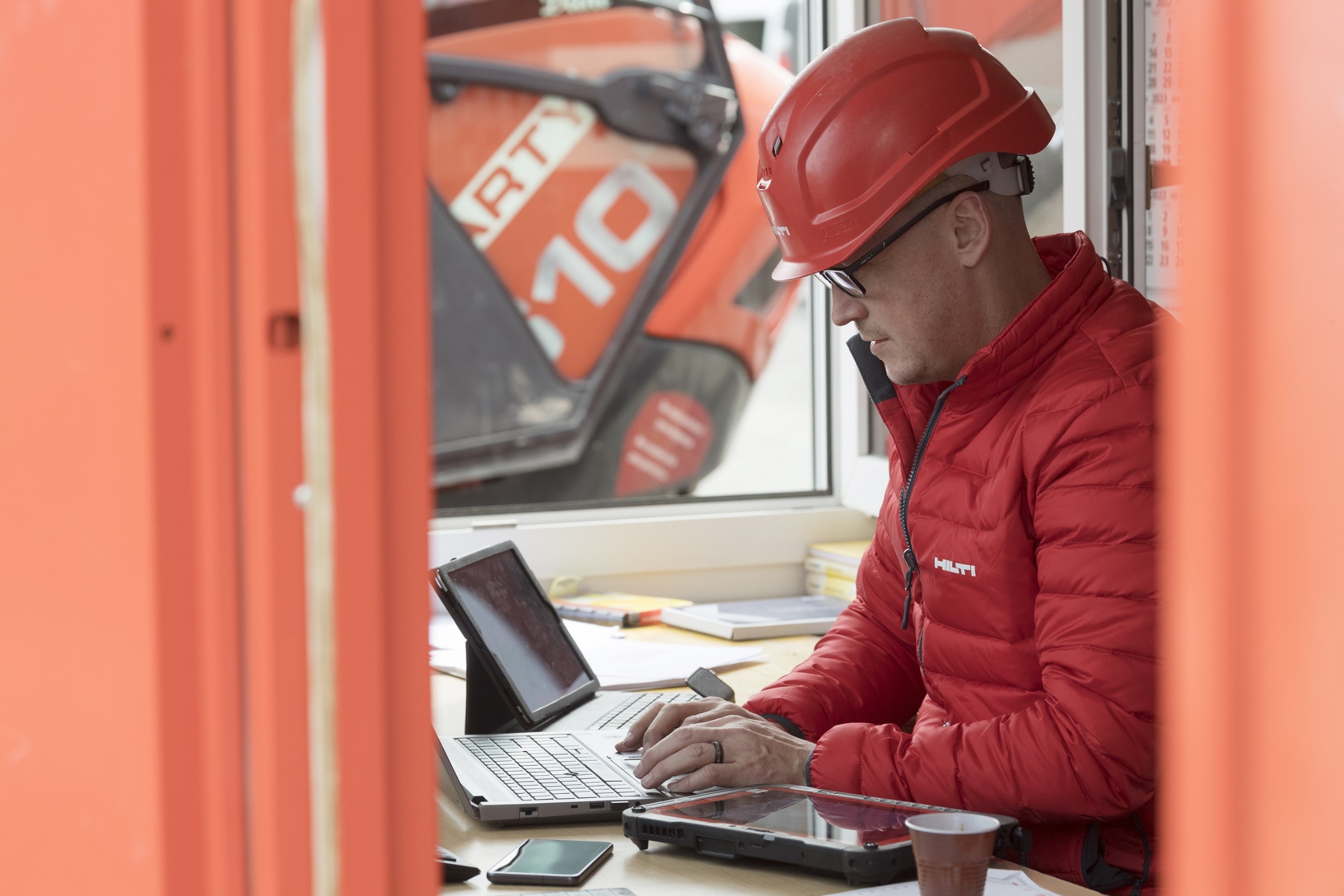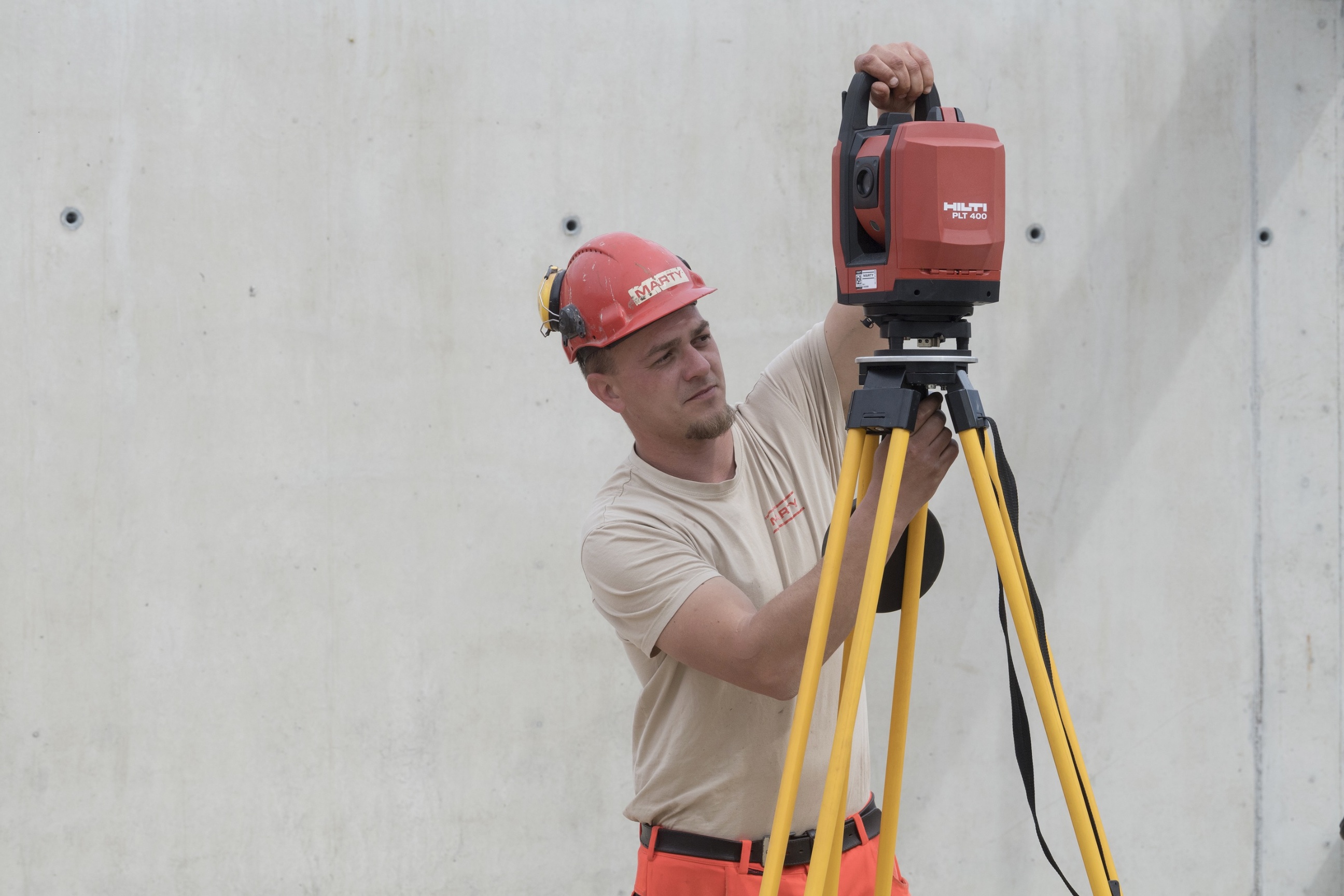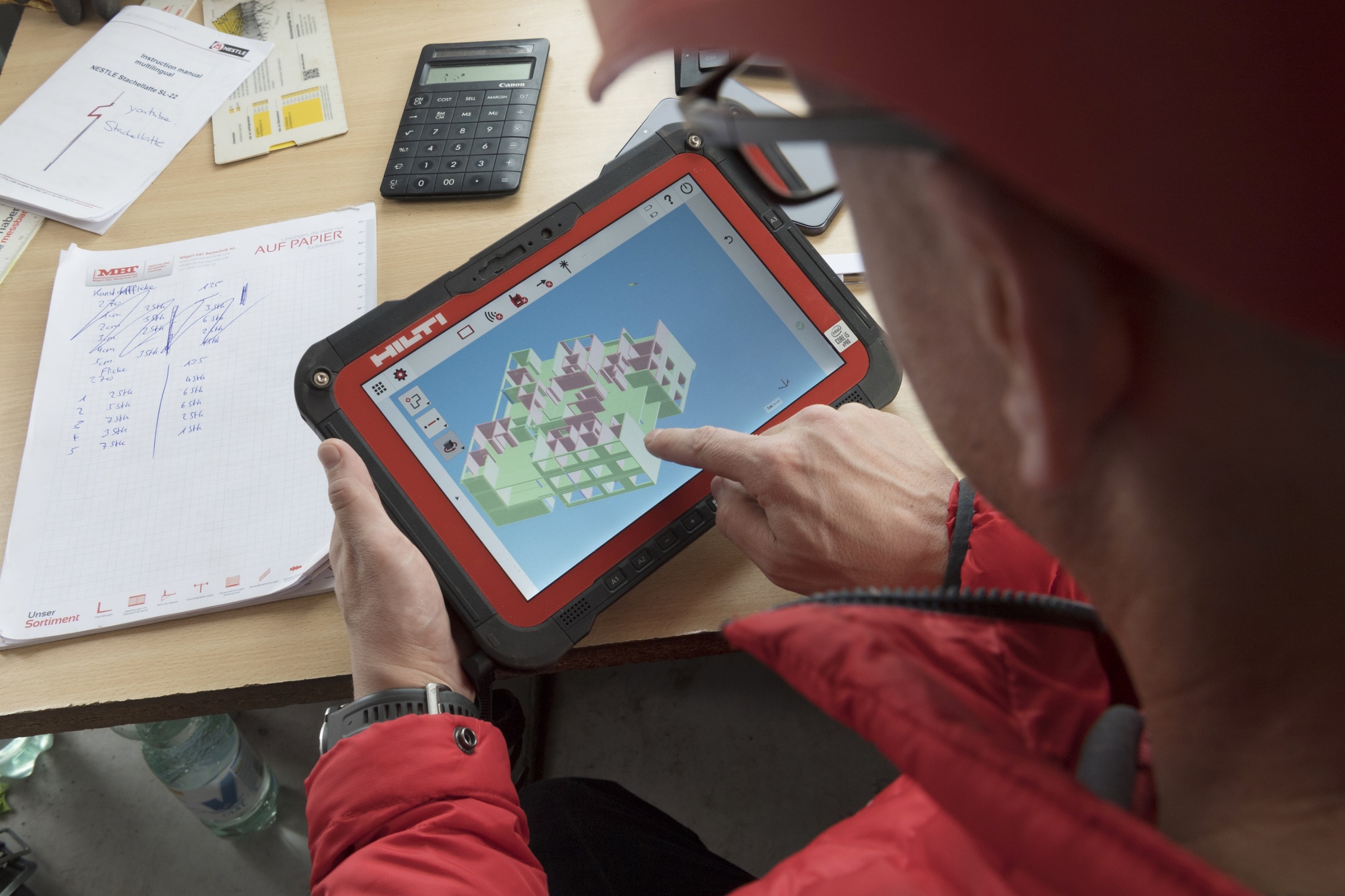 Mittlerweile ist die Einführung im Mannschaftscontainer zu Ende. Polier Fabian Weibel drängt darauf, die Software-Updates auf der Baustelle auszuprobieren. Er öffnet den roten HILTI-Koffer und greift nach der Totalstation PLT 400: ein vielseitig verwendbares, sich selbst kalibrierendes Vermessungsgerät, von dem die unterschiedlichsten Daten und Messergebnisse direkt auf das handliche Tablet übertragen werden können. Er montiert das Präzisionsmessgerät mit wenigen Handgriffen auf ein grosses, gelbes Stativ und das Tablet samt Prisma-Empfangsgerät, das mittels Laser angesteuert wird, auf ein kleineres Dreibein.