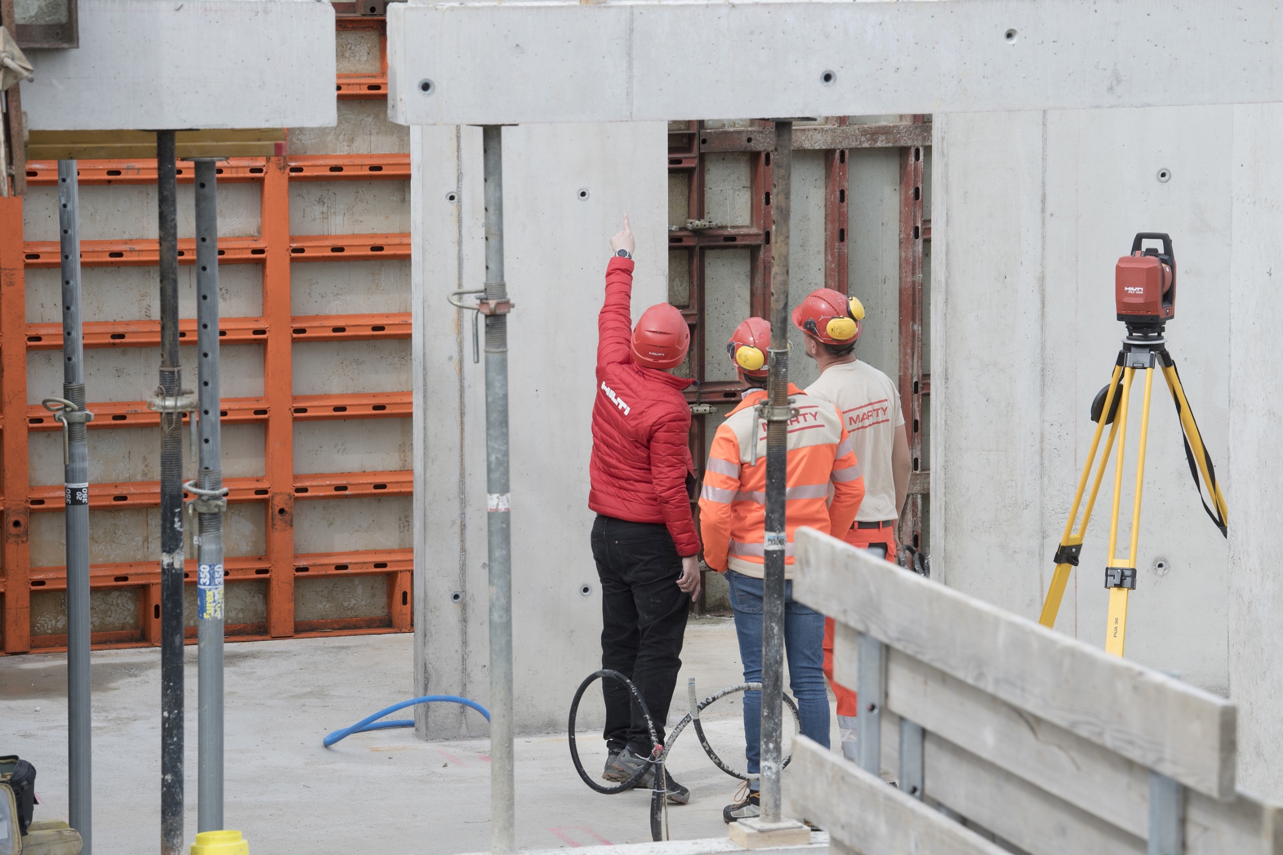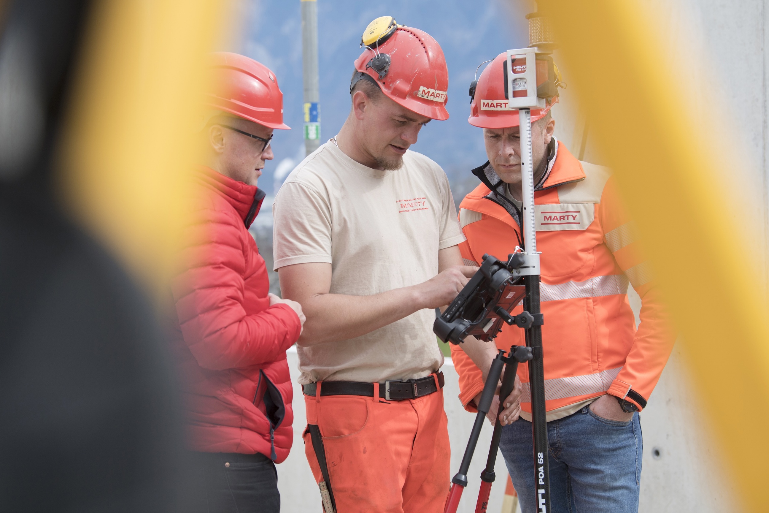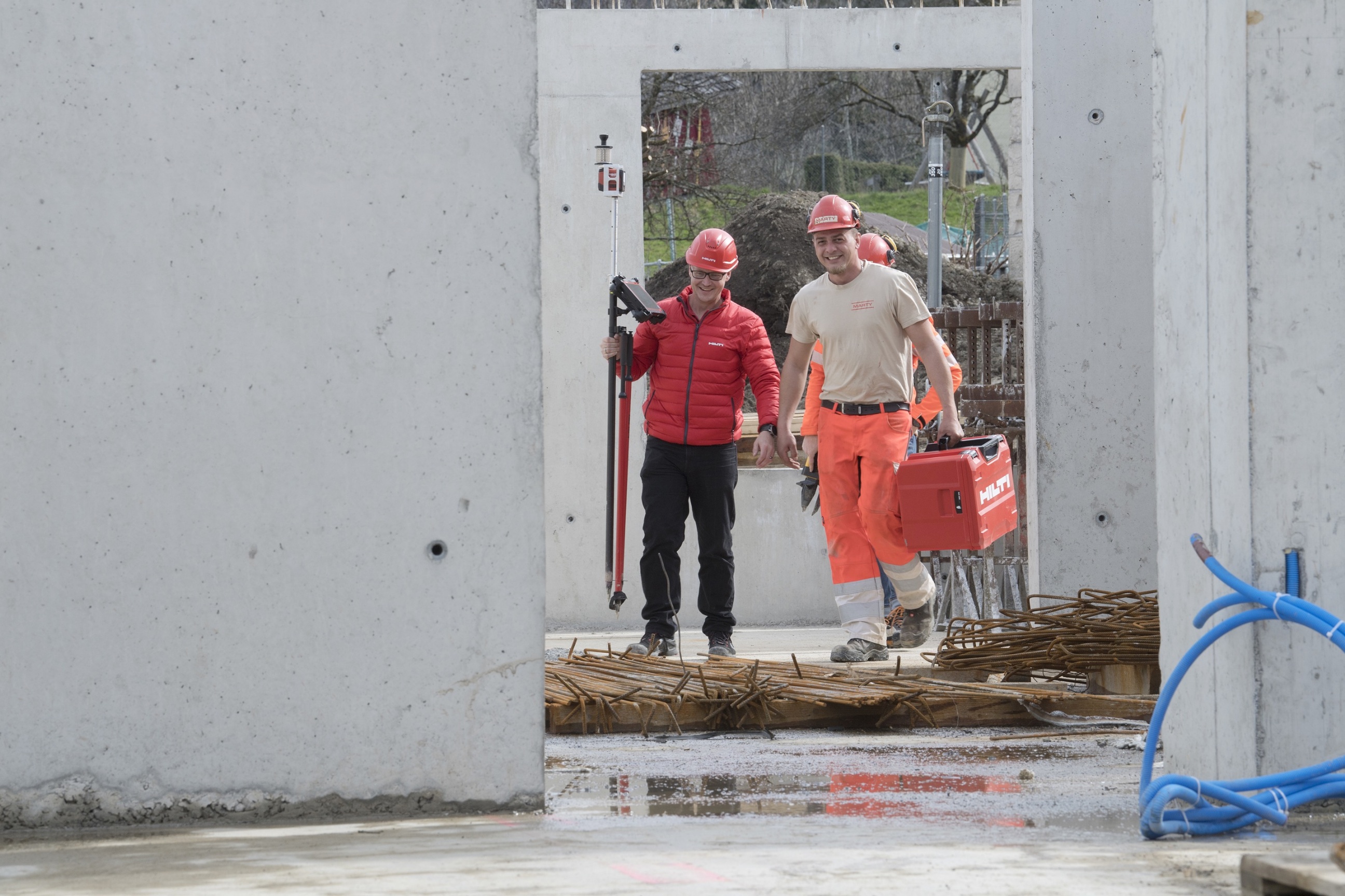 Der heutige Besuch an diesem lauen Frühlingstag verspricht hingegen das Gegenteil: Florian Köppel, Messtechnikspezialist bei HILTI, ist auf die Baustelle gekommen. Im Gepäck hat er die neuesten Updates, mit denen die unterschiedlichsten Vermessungsarbeiten auf einfachen Fingerdruck funktionieren. «Wir sind mit Hilfe von MARTY seit ein paar Monaten daran, unsere Software laufend weiterzuentwickeln. Als Bauunternehmen arbeitet MARTY ja bereits seit vielen Jahren mit unseren Geräten und die Rückmeldungen der Bauprofis sind natürlich besonders hilfreich und wertvoll für uns, um auch weiterhin eine möglichst benutzerfreundliche Software mit einfacher Navigation anbieten zu können. Nichts ist schlimmer als eine Software, die zwar in der Theorie alles bietet, aber in der Praxis unbrauchbar ist», erklärt der 41-jährige HILTI-Mitarbeiter.