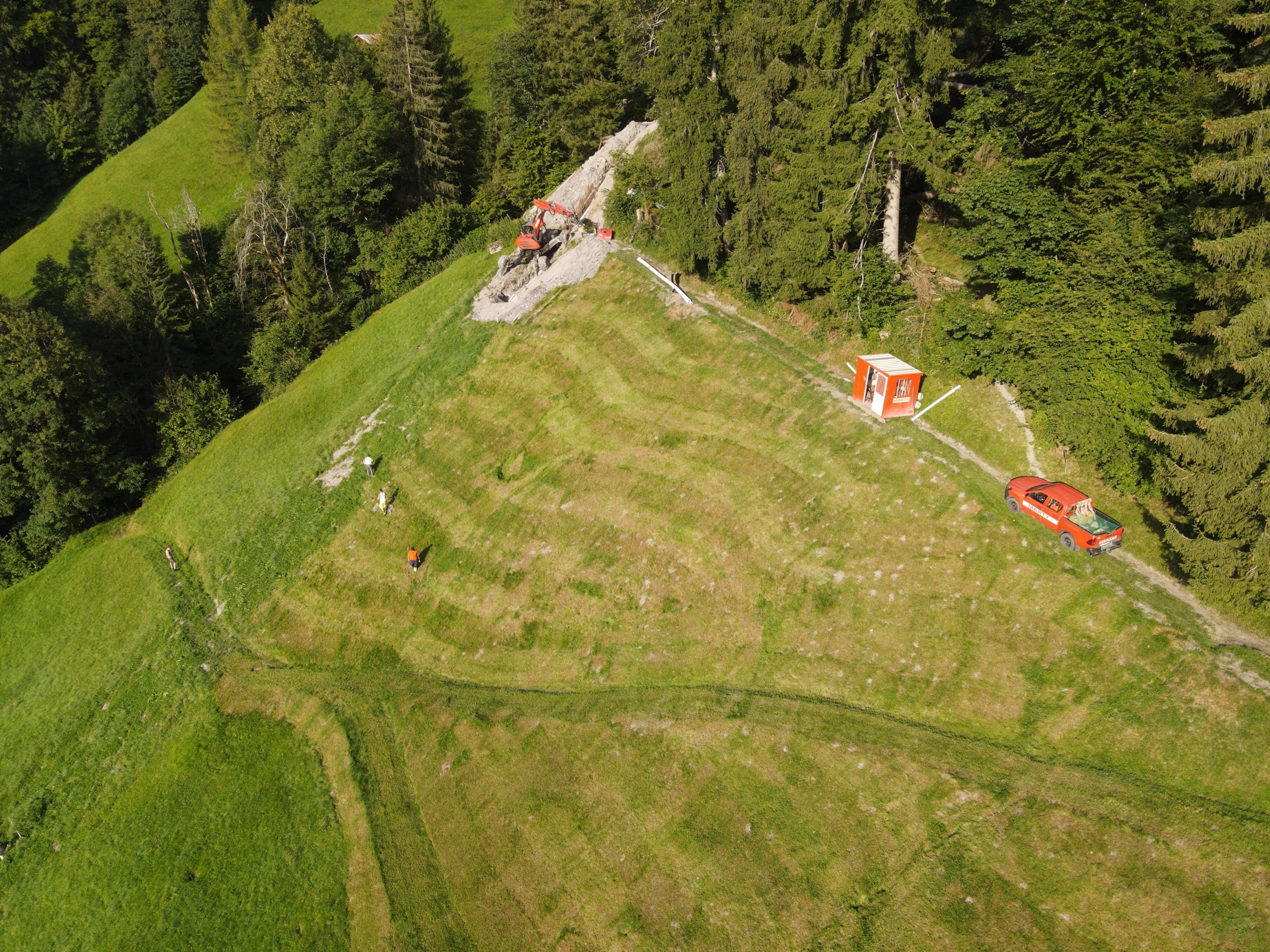 Am 27. April 2023 fiel endlich der Startschuss: Unter der vorgeschriebenen bodenkundlichen Baubegleitung begannen die Firmen Marty und Käppeli mit insgesamt drei Schreitbaggern, die alte Leitung auf einer Länge von insgesamt 1,75 km und mit einem schwindelerregenden Höhenunterschied von mehr als 755 Metern freizulegen und zu entfernen. Danach wurde im bestehenden Verlauf durch Wald und Magerwiesen der Graben mit einer Tiefe von zumindest einem bis eineinhalb Metern für die neue Leitung ausgehoben. Selbst die für extremes Gelände ausgelegten Schreitbagger mussten aufgrund der enormen Steilheit zusätzlich durch Seilwinden gesichert werden. Als weitere Erschwernis kam noch der ständige Wechsel des Untergrundes hinzu, was mehrfache Montagewechsel zwischen Löffel und Abbauhammer an den Baggern erforderte.