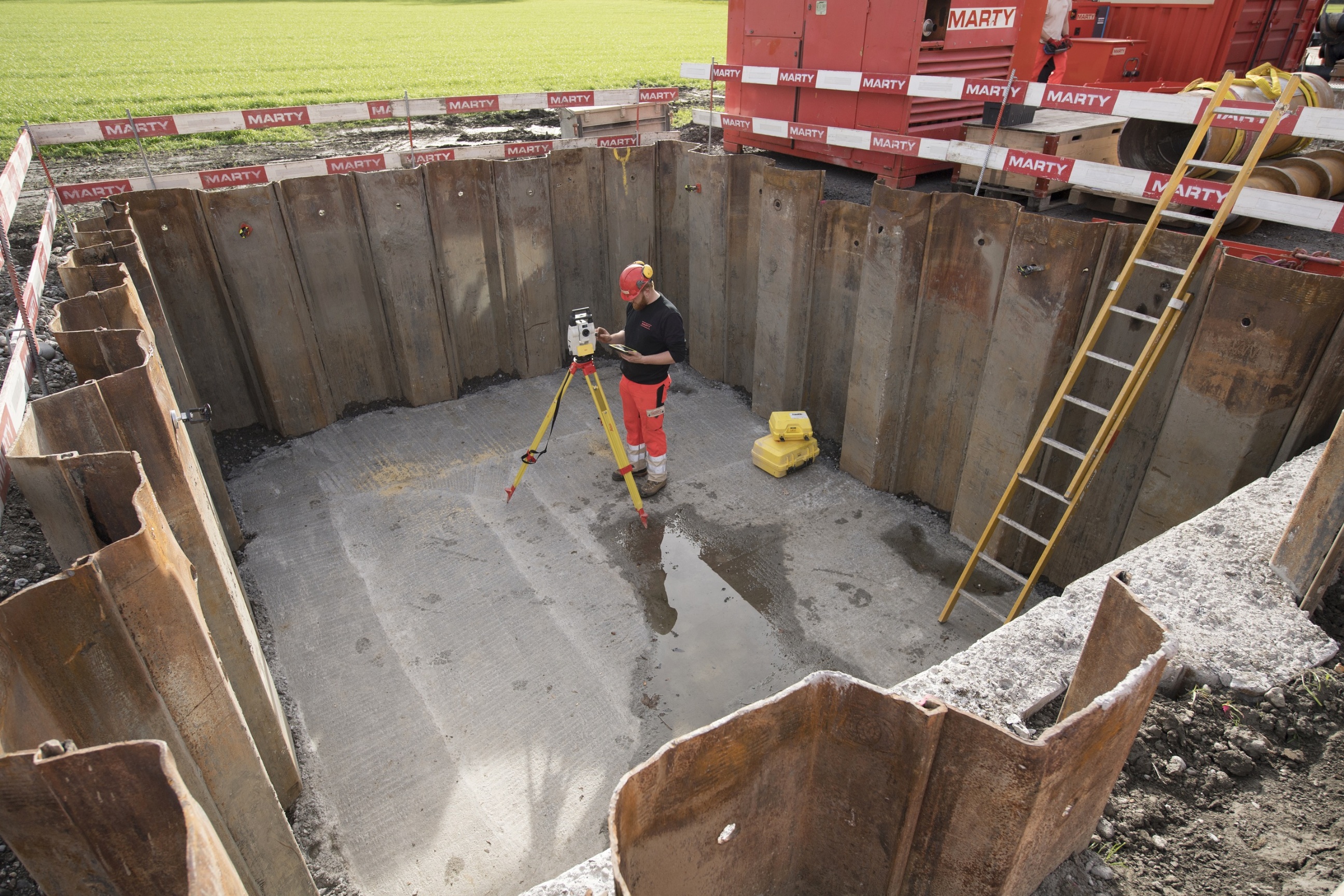 In der zweiten Baugrube, keine 20 Meter davon entfernt, ist man schon erheblich weiter. Es ist der Ort, von dem jene Leitung zum gegenüberliegenden Pumpwerk Seidenbaum gebohrt wird, durch die später das gesamte Wartauer Abwasser Richtung ARA Sargans fliessen wird. Hanspeter Eggenberger montiert gerade mehrere Messprismen an den Spundwänden der am Boden und in Bohrrichtung bereits ausbetonierten Startgrube. «Das sind wichtige Messpunkte für den Geometer, der jene Koordinaten ermittelt, nach denen wir dann unsere Pressbohrmaschine exakt einrichten können», erklärt der 42-jährige Marty-Vorarbeiter. Man ist gut im Zeitplan, denn schon heute wird das gesamte dafür nötige Inventar mit zwei LKWs angeliefert.