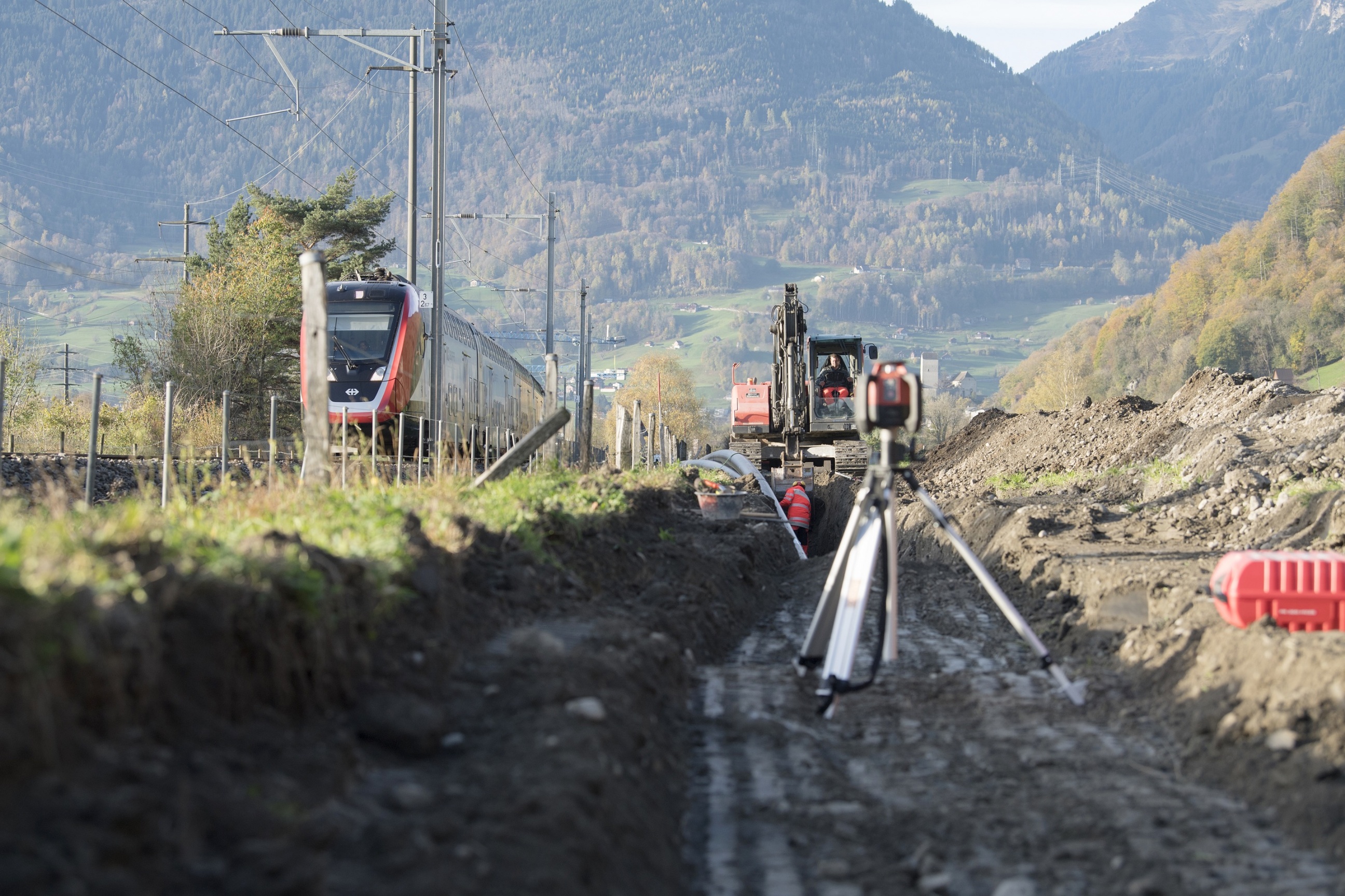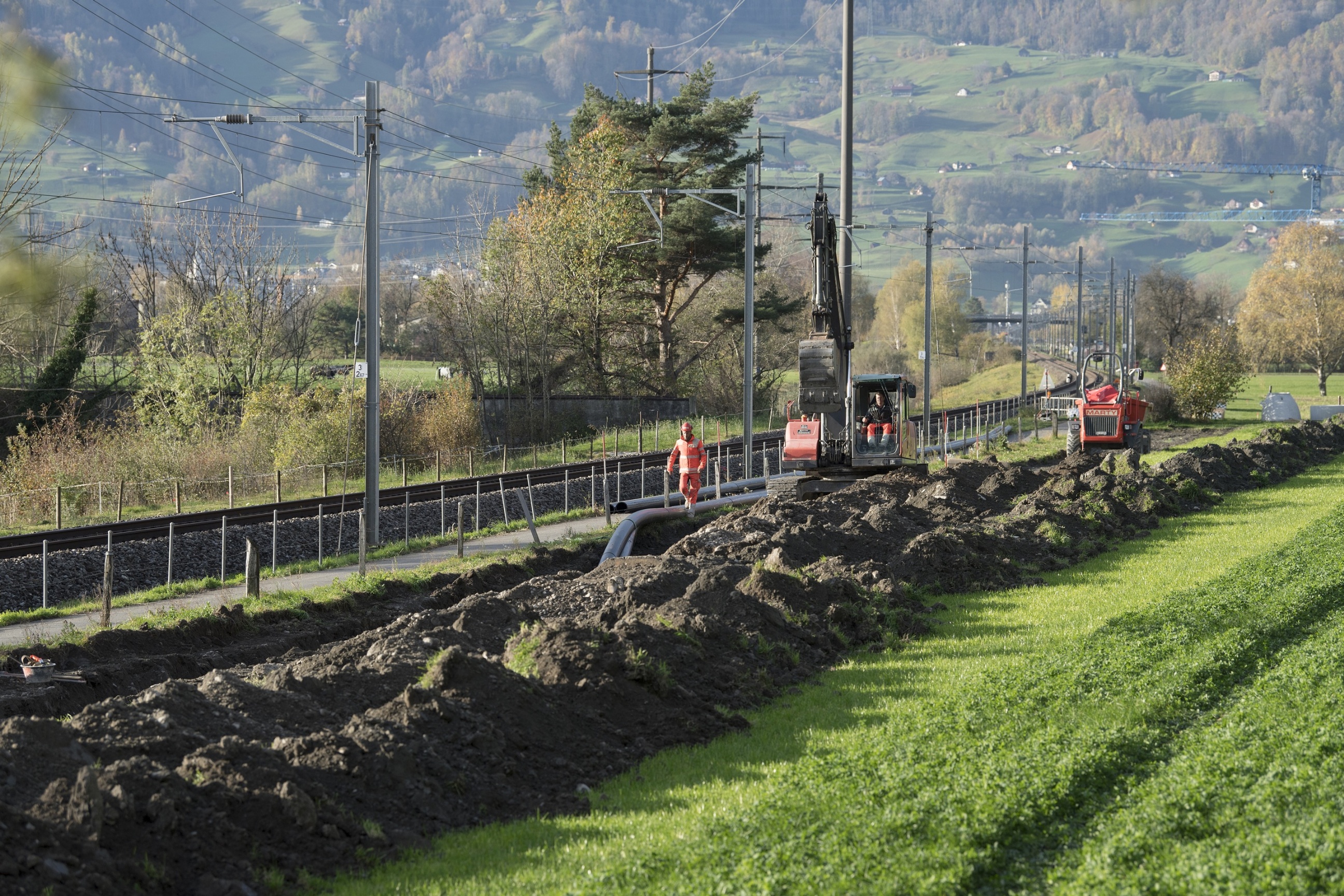 Auf den ersten Blick gibt es auf der Baustelle gegenüber des Pumpwerks Seidenbaum in Trübbach vor allem eines: viel Platz. Doch die weiten, grünen Felder im Hintergrund täuschen. «Wir arbeiten hier sehr nahe an den Gleisen und der Fahrleitung der SBB-Trasse. Das erfordert strenge Sicherheitsauflagen, die wir hier unbedingt einhalten müssen», erklärt Projektleiter Philipp Heeb ernst, als er die beiden Startgruben vor Ort inspiziert. Die eine davon wird gerade erst vorbereitet. Während Vorarbeiter Christian Lenherr mit dem Bagger entlang von pink leuchtenden Bodenmarkierungen Spundwände gekonnt und vorsichtig in die Erde treibt, gibt ihm sein Kollege Vitalii mit Handzeichen Bescheid, ob der Winkel auch passt. Ist die Baugrube erst ausgehoben und fertig eingerichtet, wird hier mittels Pressbohrung unterhalb der SBB-Trasse das Rohr für sämtliche technischen Leitungen verlegt, die für die Steuerung der Druckleitung erforderlich sind.