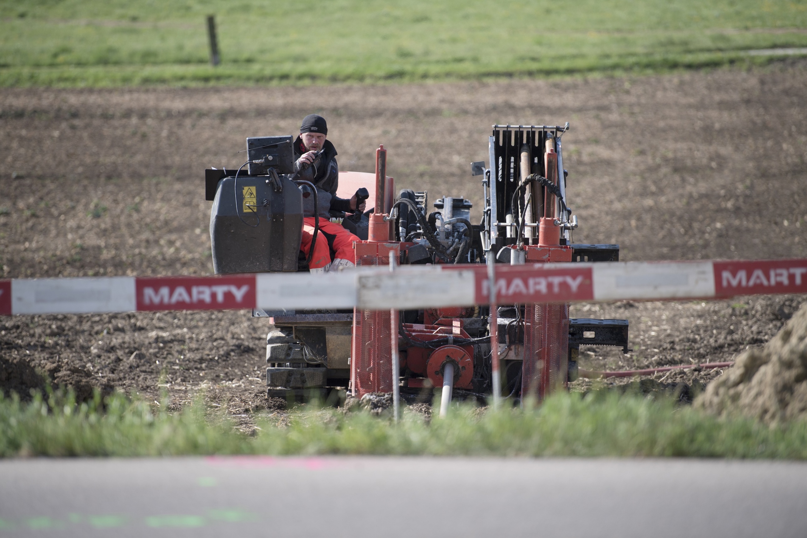 «Wir sind gut in der Zeit», versichert Jens Reiss, der gerade am Falcon F5, dem Messgerät für die Steuerung des Bohrkopfes, sitzt. Der 41jährige Vorarbeiter arbeitet seit 2018 bei MARTY. Seither wird er vor allem als Experte für Spülbohrungen eingesetzt. «Solche Spülbohrungen brauchen viel Erfahrung. MARTY ist in diesem Bereich wirklich toll aufgestellt, es gibt nicht viele Baufirmen in der Schweiz, die das so beherrschen und anbieten können», ist Jens Reiss überzeugt, ehe er wieder auf der Horizontalbohrmaschine der Marke Vermeer Platz nimmt. Mit rund 10 bis 12 Tonnen Zugkraft Platz zählt diese im MARTY-Gerätepark eher zu den kleineren von insgesamt 6 solcher Bohrmaschinen. Grössere haben sogar eine Zugkraft von über 40 Tonnen.