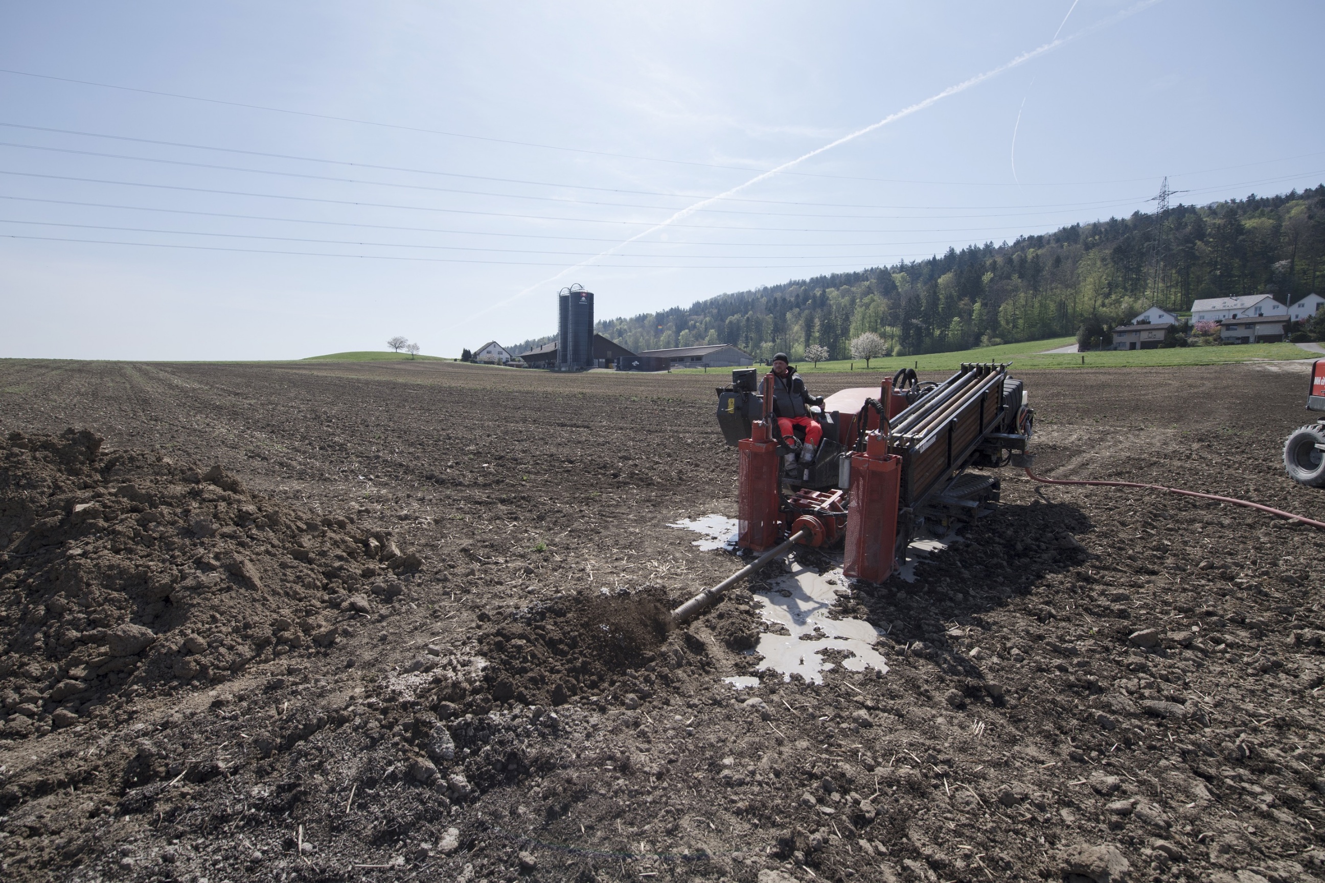 Dennoch hat sich der Bohrkopf erstaunlich schnell durch den lehmigen Untergrund gearbeitet, das eingespielte Team bereitet schon den Einzug der Leitungsrohre vor. Neben dem Feldweg liegt dafür bereits ein 30 Meter langes, vorab aus drei Teilstücken zusammengeschweisstes Rohr. Vorsichtig wird dieses von Stefan Marquart mit der Baggerschaufel in Position gehoben und an der, aus dem Lehmboden ragenden Bohrstange angehängt. Nun geht es in die andere Richtung: das Leitungsohr mit einem Aussendurchmesser von beachtlichen 355 mm wird unter einer wilden Geräuschkulisse aus lautem Stromaggregat, schwer arbeitender Zugmaschine und unzähligen Funksprüchen durch den frisch angelegten Bohrkanal gezogen. Während das Rohr nach und nach im Boden verschwindet, quillt eine tonhaltige Bentonit-Wasser-Mischung aus der Erde. «Die wird durch die innen hohlen Bohrstangen vor den Räumer gespült, damit der Kanal freigehalten und gleichzeitig das Bodenmaterial nach aussen transportiert wird», erklärt der 51jährige Maschinist. «Das genaue Mischungsverhältnis muss man dabei immer gut an den jeweiligen Boden anpassen.»