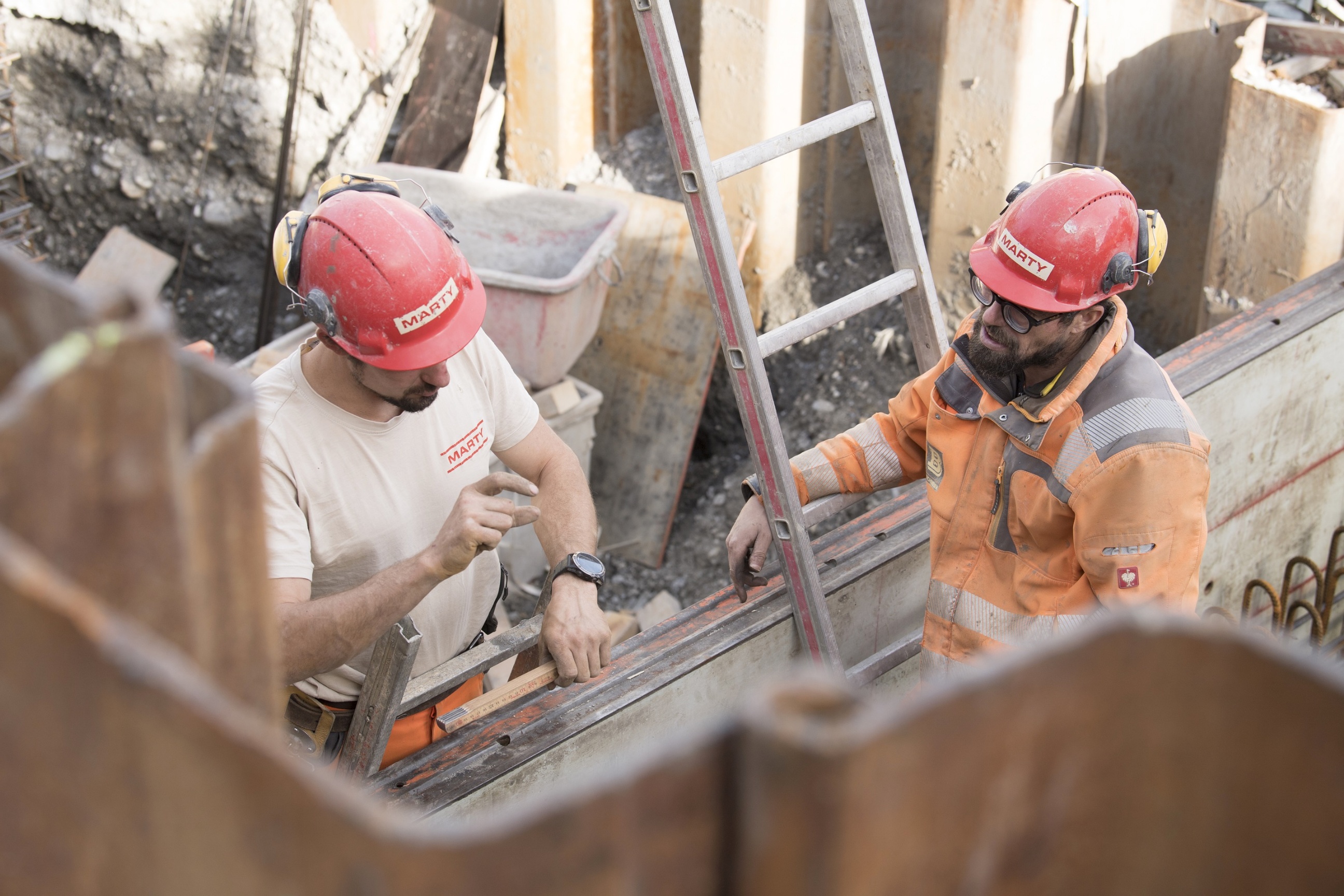 An den mehr als feuchten Start erinnert am heutigen Tag nur wenig. Zum einen, weil schon der Morgen einen schönen, trockenen Herbsttag verspricht, zum anderen weil nach wie vor eine Pumpe auf Dauerbetrieb läuft, um das überschüssige Grundwasser in Richtung eines eigens dafür aufgestellten Absetzbecken zu leiten und so die bereits betonierte und von Spundwänden umgebene Baugrube trocken zu halten. «Sonst würden wir auch jetzt noch innerhalb von zwei Minuten knietief im Wasser stehen», lächelt Vorarbeiter Vinzenz Dieing unter seinem Marty-Bauhelm. Der 34-jährige Vorarbeiter nimmt heute mit seinem kleinen Trupp das Betonieren der Seitenwände des Pumpenraumes in Angriff. An einem Rand der Baugrube biegen dafür die beiden Kollegen Jose und Fahret unzählige, starke und lange Stahlstäbe auf die erforderlichen Längen zurecht, um für die nötige Bewehrung zu sorgen. Am anderen Rand steht Vinzenz, um mit mehreren Spriessen zwischen Spundwand und der dort bereits errichteten, zweihäuptigen Schalung die einhäuptige Schalung auf der gegenüberliegenden Seite abzustützen. «Es braucht diesen Gegendruck, weil wir dort durch eine bestehende Gebäudewand ja nicht von zwei Seiten schalen können», erklärt der gebürtige Allgäuer, während er einen weiteren Spriess mit viel Muskelkraft im engen Spalt verspreizt. Zwischendurch spannt er über die ganze Baugrubenlänge gelbe Schnüre, um entlang dieser mit einem Meterstab die exakten Abstände zu kontrollieren.