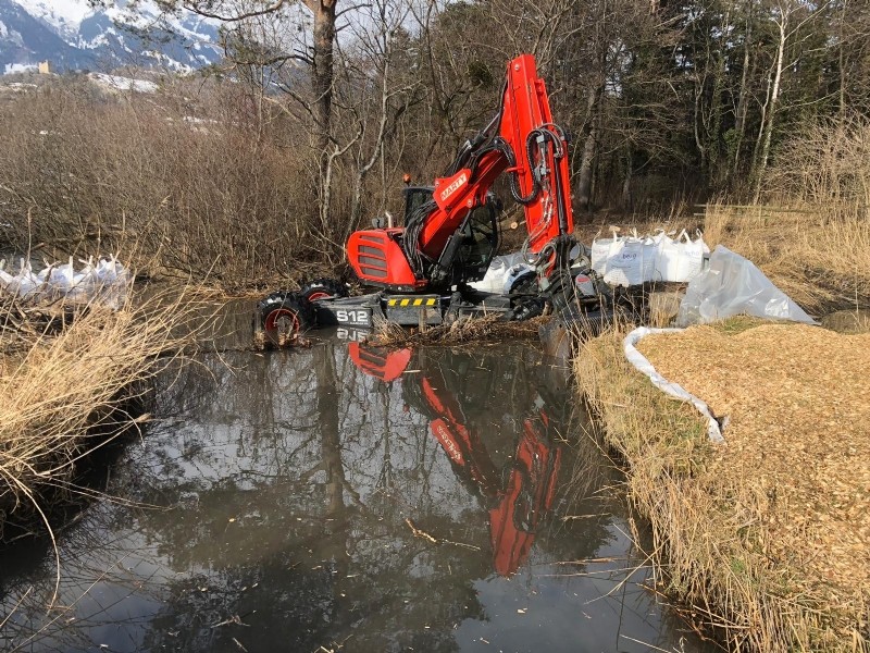 Abbruch Ufermauern 187m³, Abtrag Oberboden, Walderde und Unterboden 1'137m³, Aushub für Gerinnengestaltung, Rampen, Blockverbauung 2'608m³, Einbau Oberboden, Walderde und Unterboden 3'640m², Natursteine bis 1'000kg insgesamt 385to.