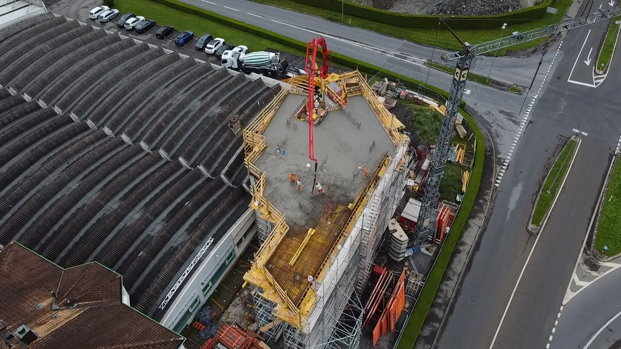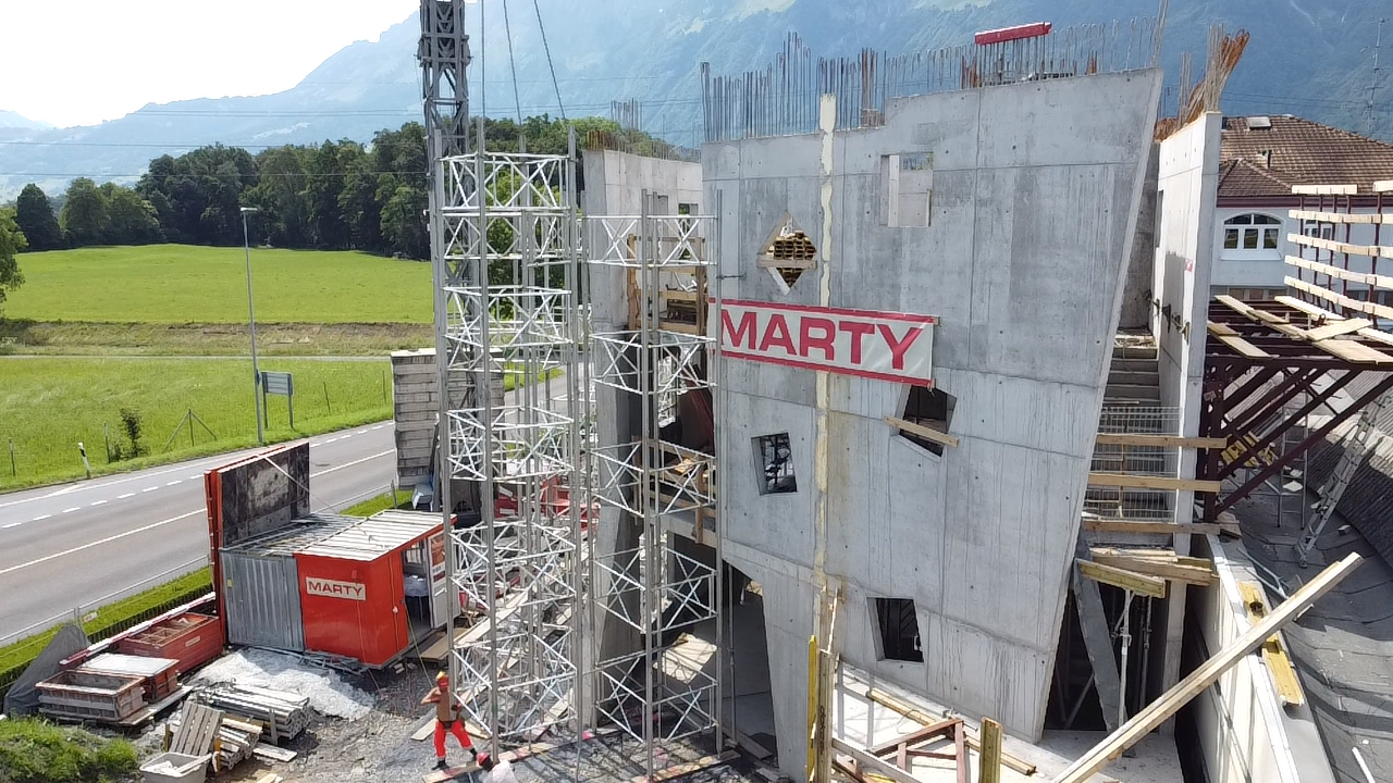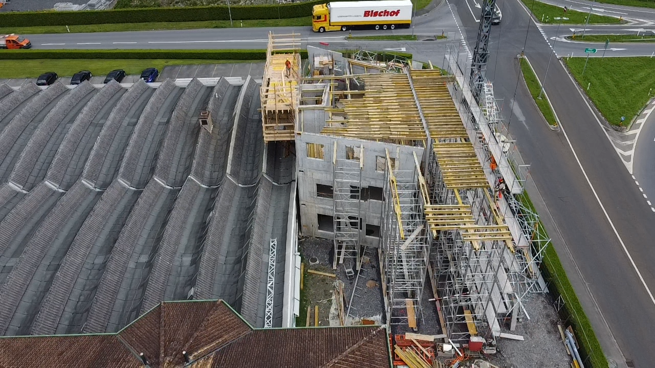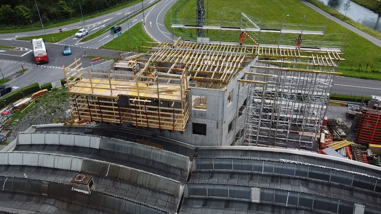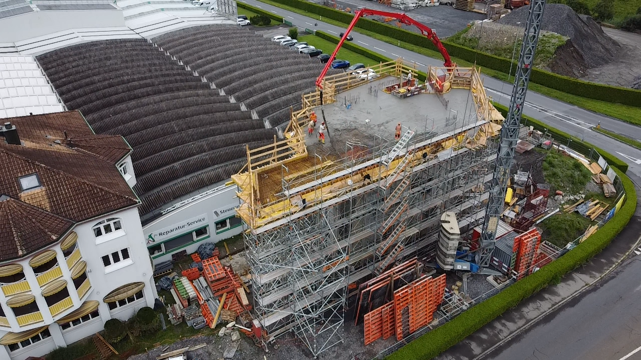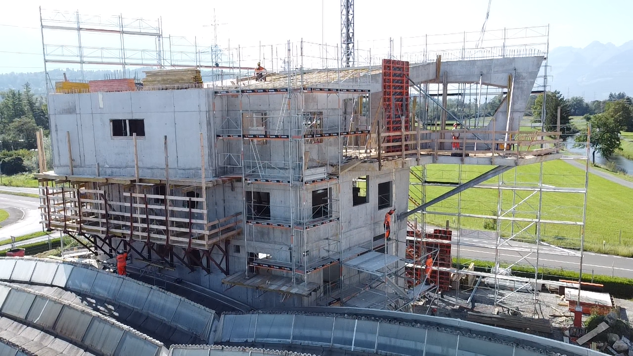 Für die bis zu 10 m hohe Auskragung im obersten Geschoss kam ein Spriessgerüst zum Einsatz, zusätzlich abgestützt durch versetzte, tonnenschwere Stahlstützen, die einbetoniert werden mussten. Über dem Altbau ermöglichten massive Konsolen die Deckenschalung, während die letzte Decke mit stark geneigter Untersicht höchste Präzision erforderte.