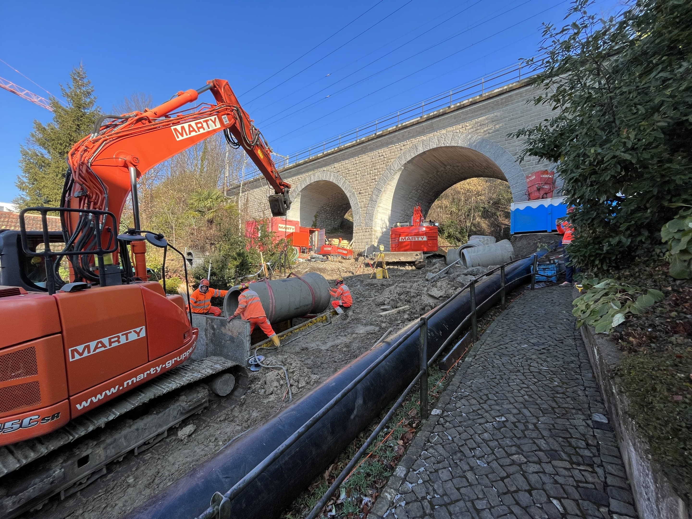 90m Stahlbetonrohre DN 1000, 420m² Spriessungen, Wasserhaltung, Rodungen, Rückbauten und Erdarbeiten.