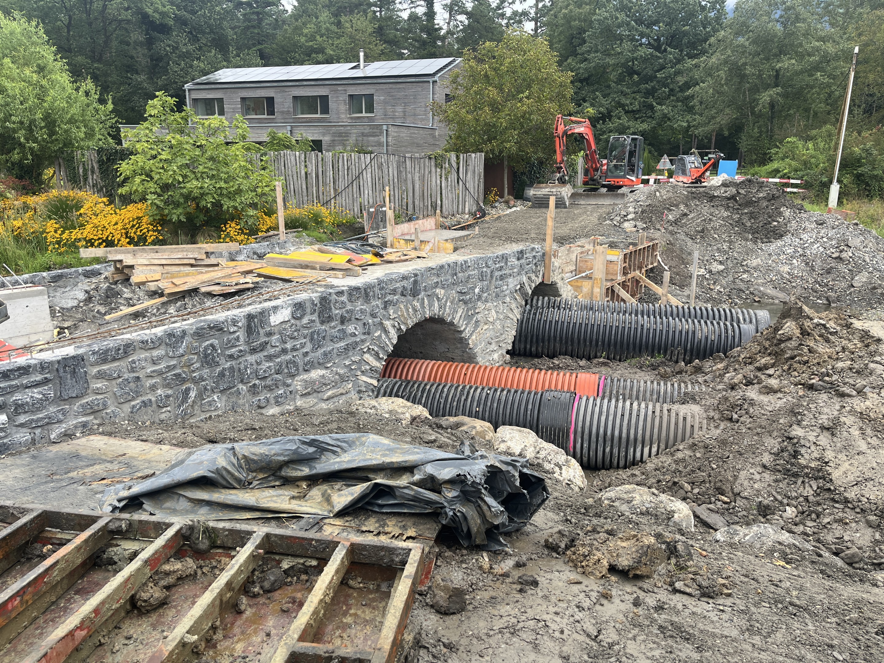Bachumleitung gemäss Vorschlag Unternehmer, Wasserhaltung, Sanierung Natursteinmauerwerk, Werkleitungsarbeiten, Kordon im Beton, Gestaltungs- und Belagsarbeiten