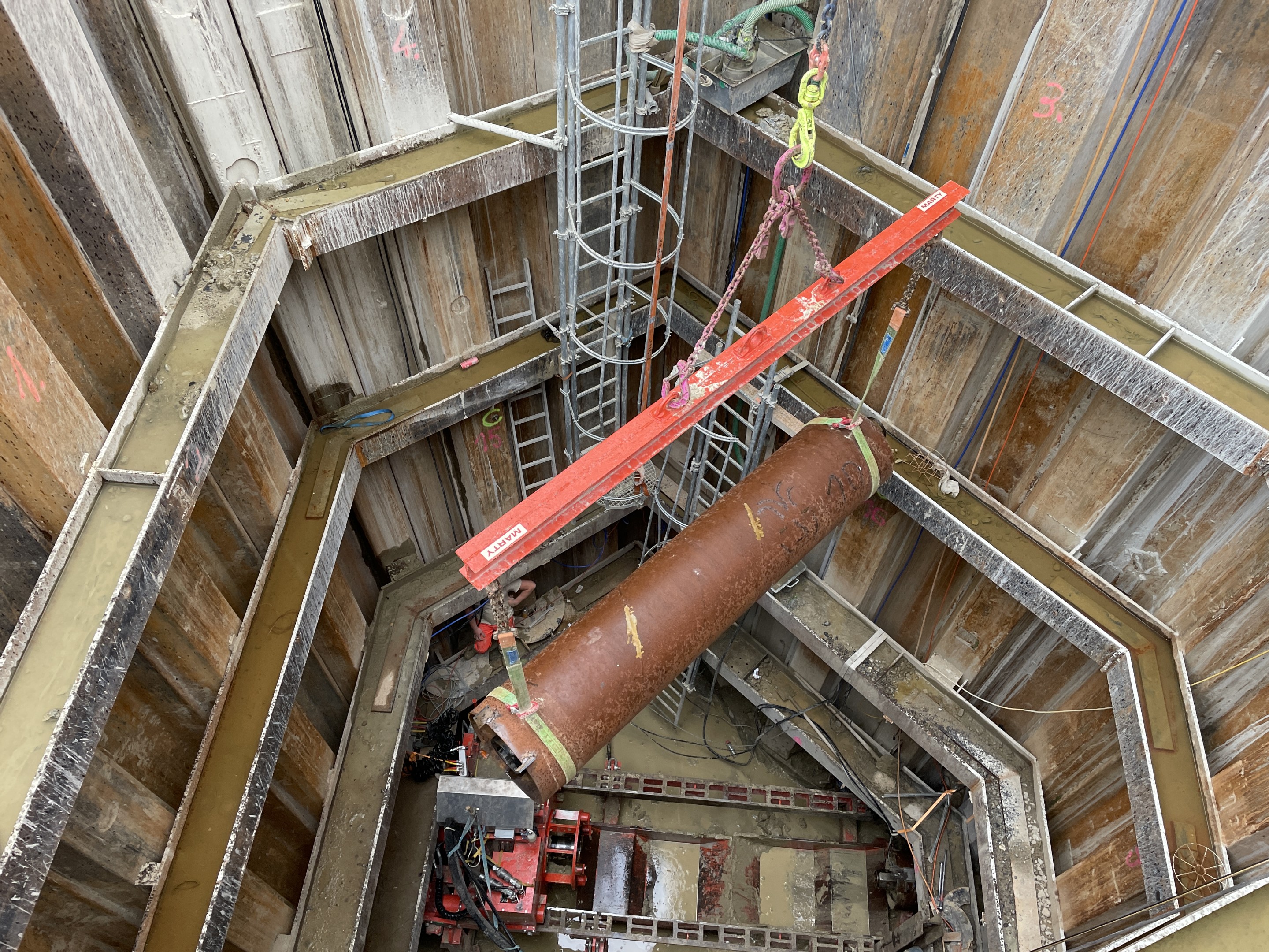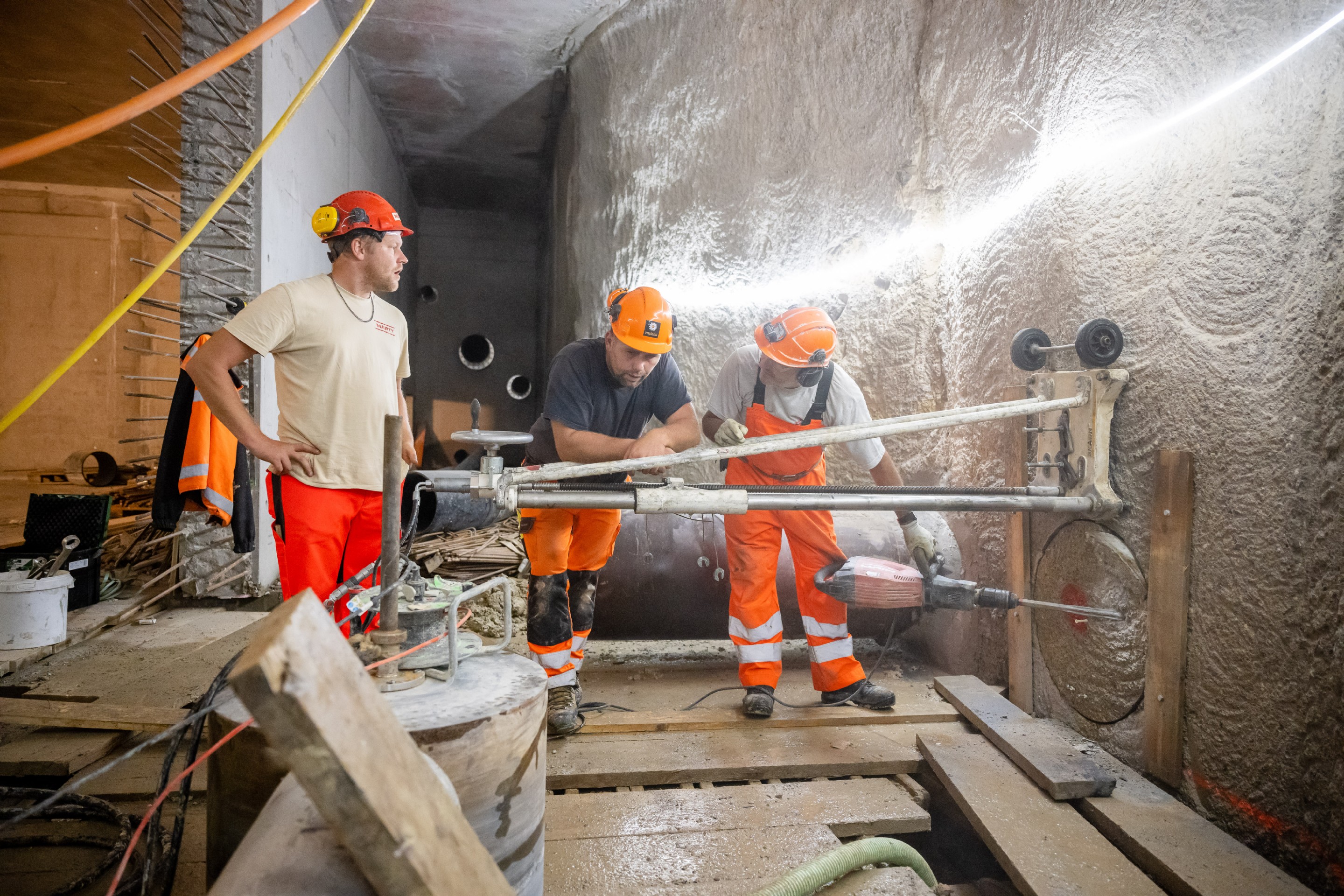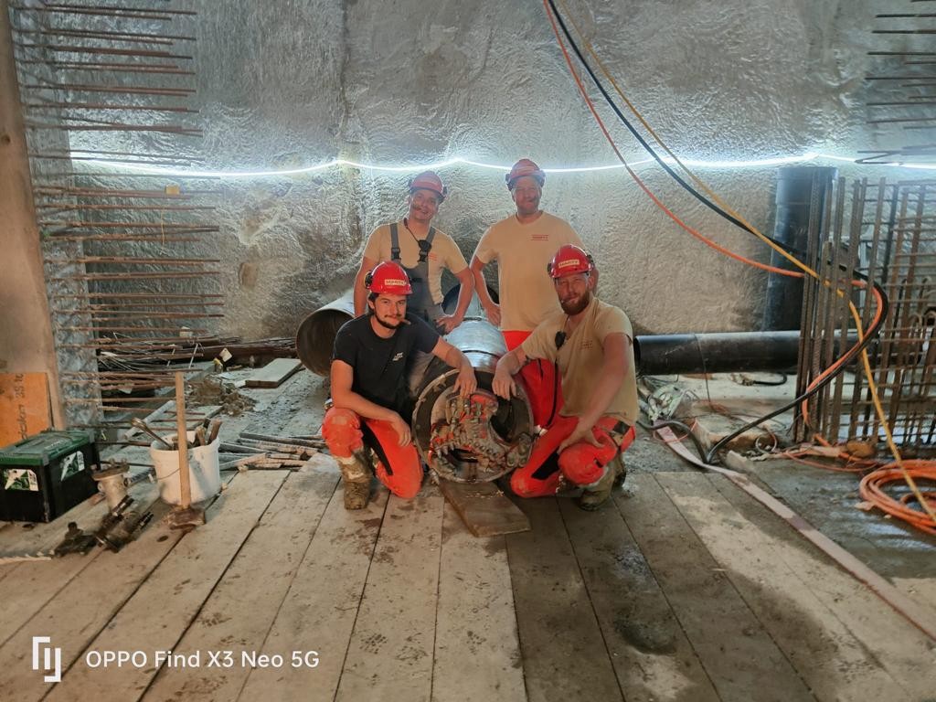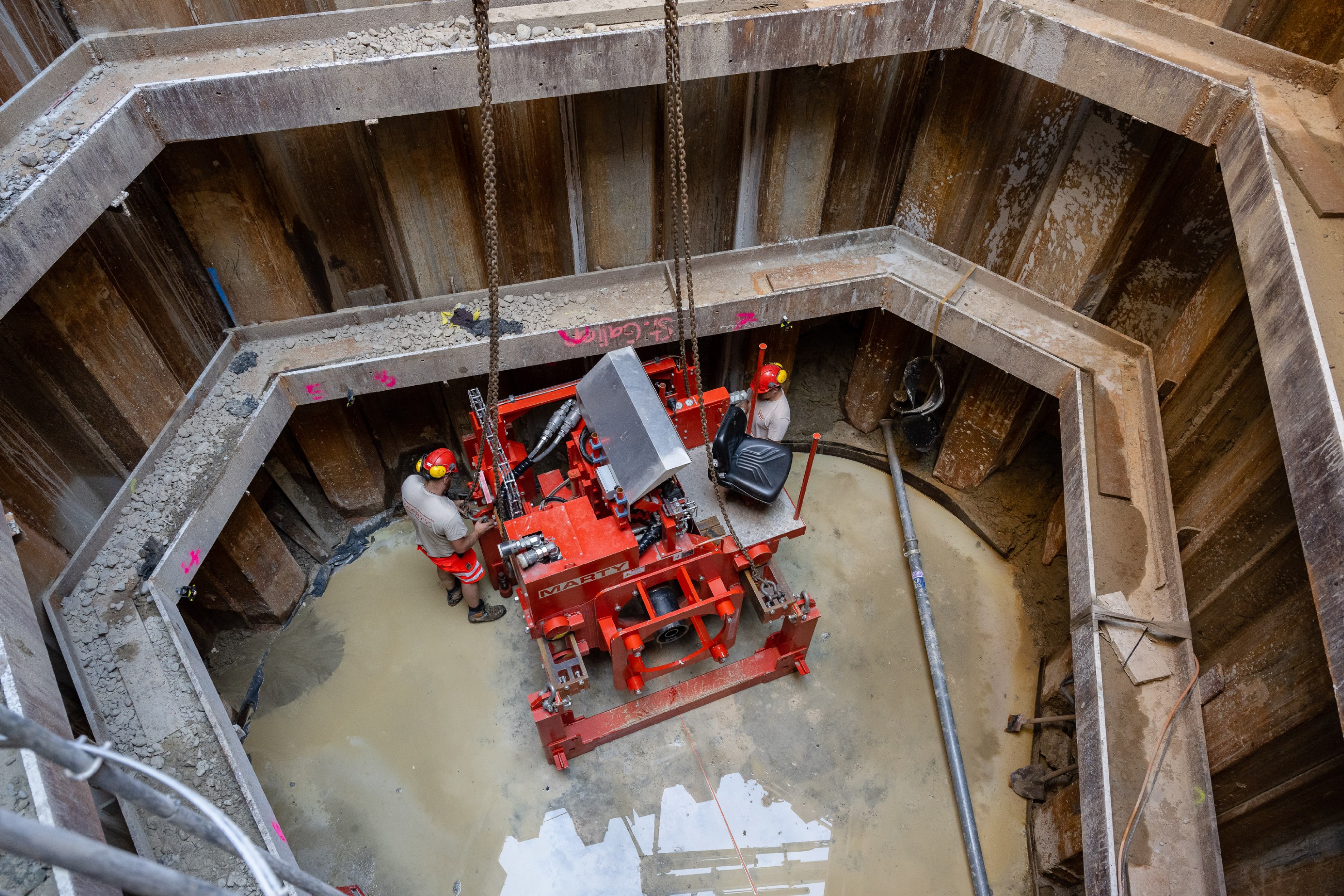 Für den Neubau des Kantonsspitals St. Gallen wurden zwei parallel laufende Entwässerungsleitungen (DN400 und DN500) mit einer Länge von rund 30m erstellt. Da der Neubau sehr tief in den Boden eingebunden ist (ca. 12m) wurden auch die Entwässerungsleitungen in dieser Tiefe verlegt werden. Die Leitungen wurden in einem Vereingigungsbauwerk (ca. 11m tief) zusammengeführt und in einem DN600 Rohr über rund 10m zur bestehenden Kanalisation geführt. Aufgrund der Tiefe und der bestehenden Werkleitungen, sowie dem quer durchlaufendem Patientenkorridor, war eine konventionelle Verlegung der Entwässerungsleitung nicht möglich.