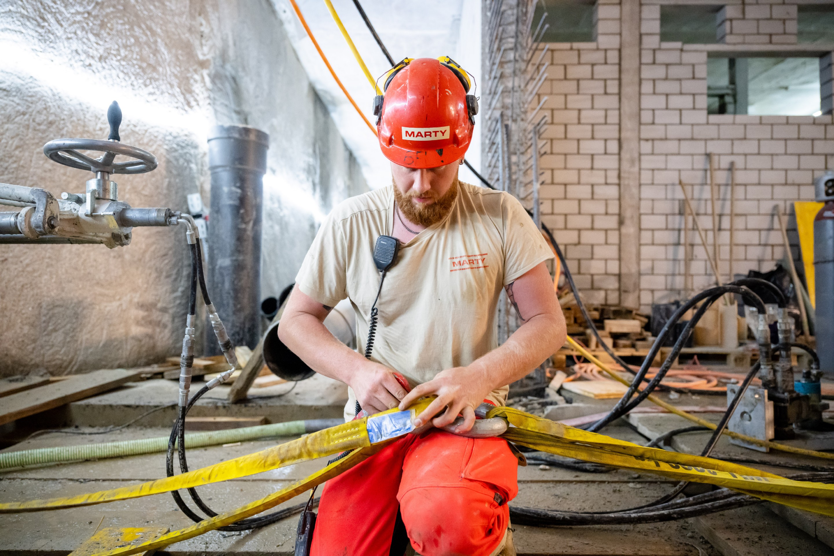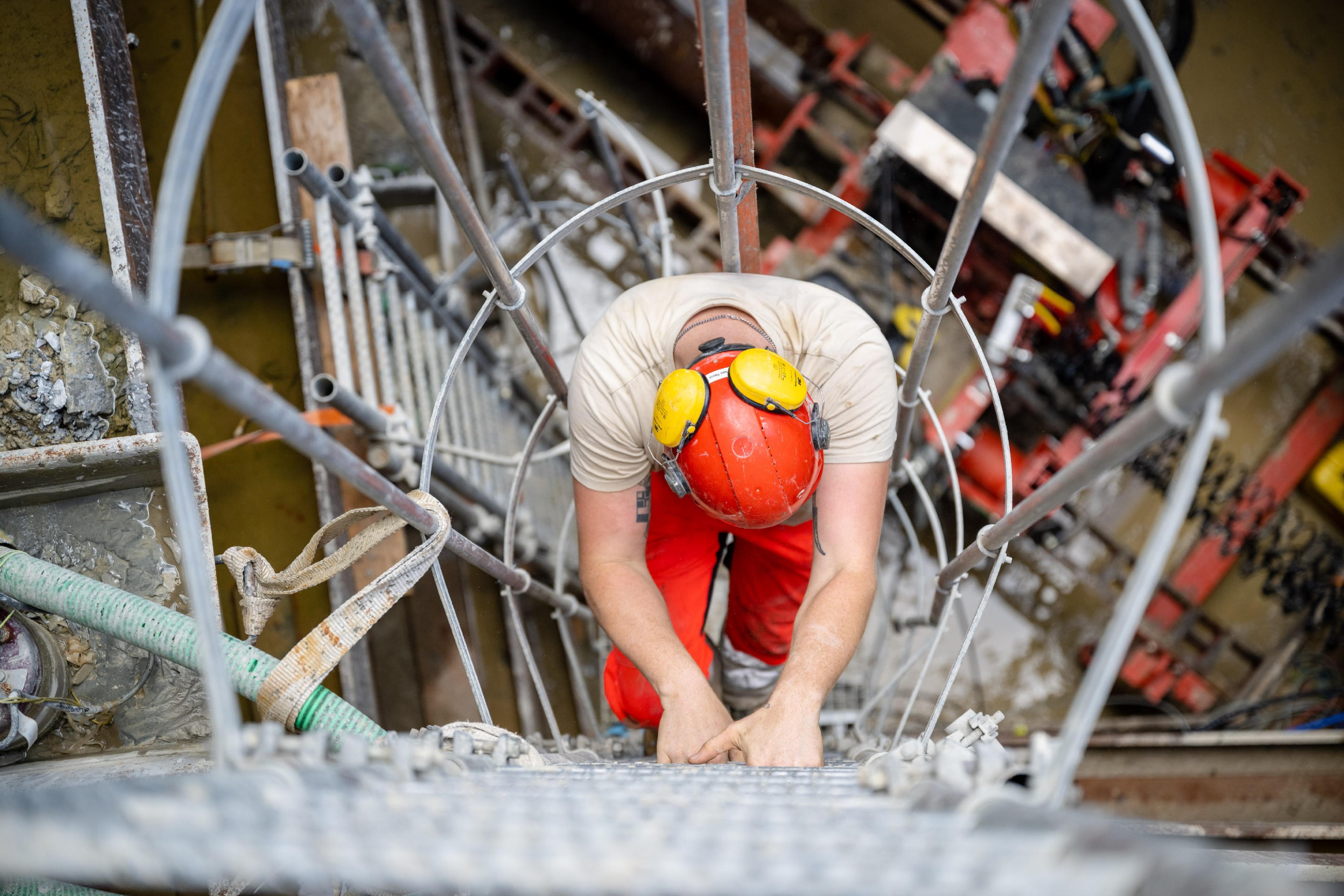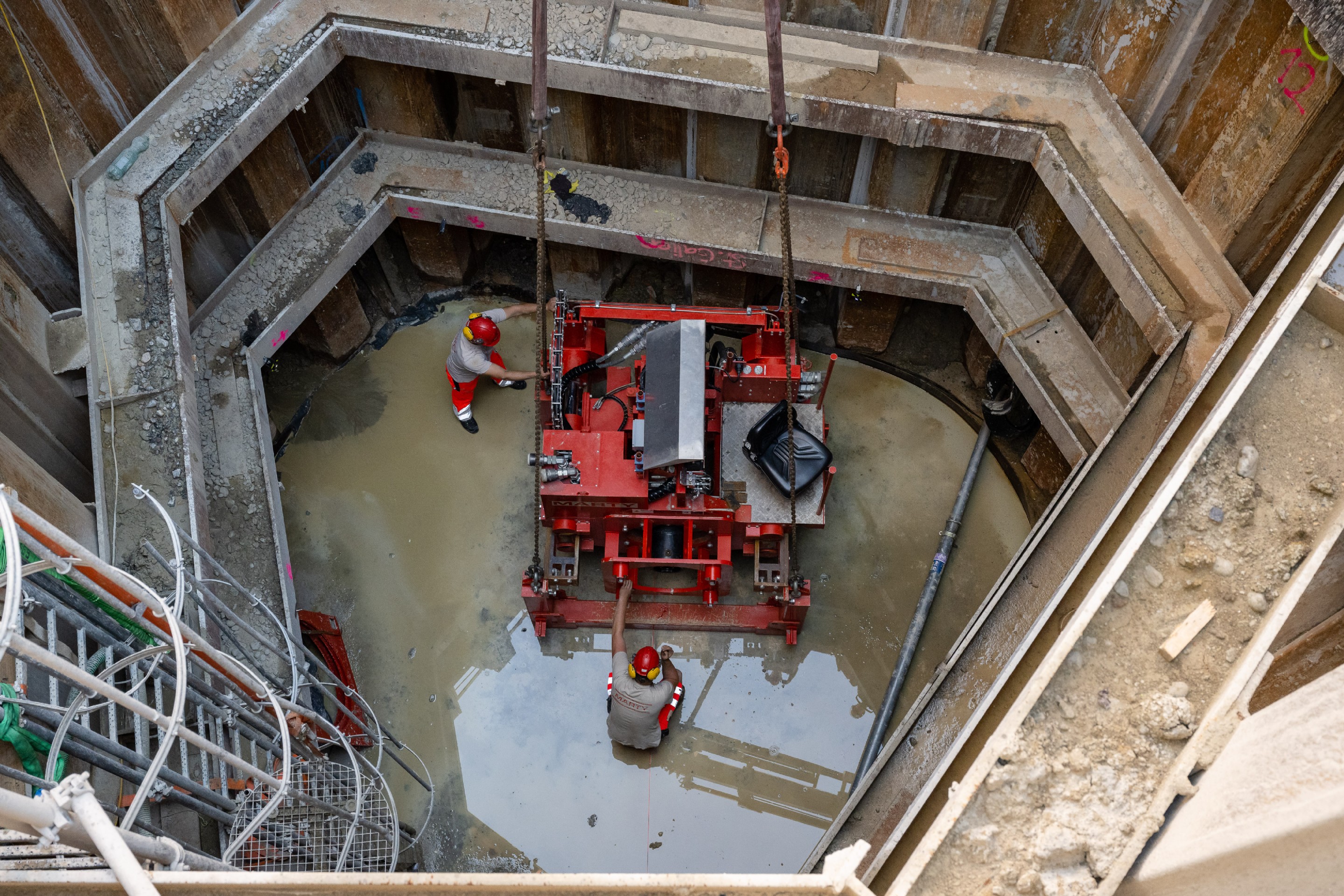 Für den Neubau des Kantonsspitals St. Gallen wurden zwei parallel laufende Entwässerungsleitungen (DN400 und DN500) mit einer Länge von rund 30m erstellt. Da der Neubau sehr tief in den Boden eingebunden ist (ca. 12m) wurden auch die Entwässerungsleitungen in dieser Tiefe verlegt werden. Die Leitungen wurden in einem Vereingigungsbauwerk (ca. 11m tief) zusammengeführt und in einem DN600 Rohr über rund 10m zur bestehenden Kanalisation geführt. Aufgrund der Tiefe und der bestehenden Werkleitungen, sowie dem quer durchlaufendem Patientenkorridor, war eine konventionelle Verlegung der Entwässerungsleitung nicht möglich.