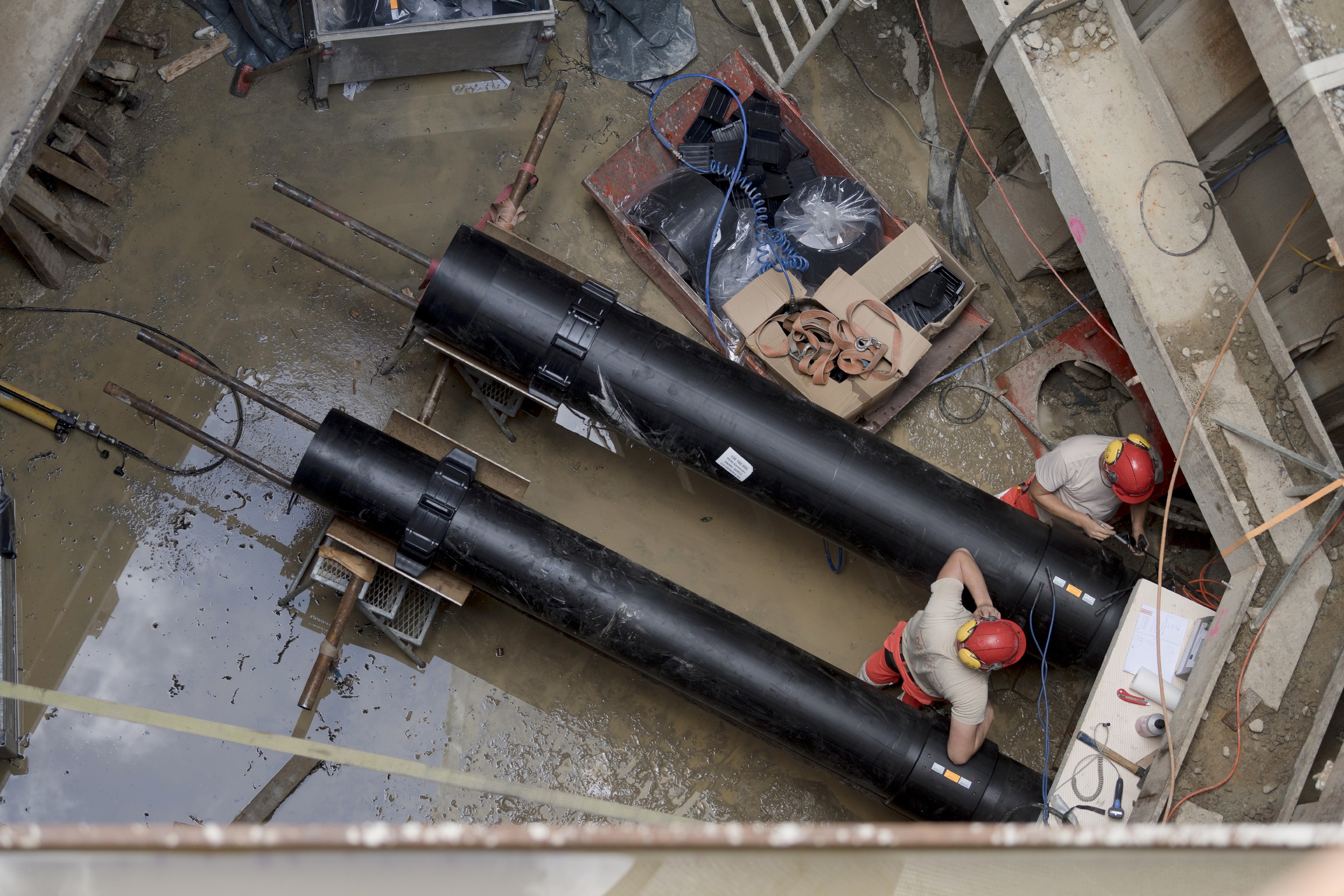 Zwei parallel verlaufende DN600 Stahlrohre mittels gesteuertem Pressbohrvortrieb auf einer Länge von jeweils 30m und ein DN800 Stahlrohr auf einer Länge von 10m. Liefern und Einbauen der HDPE-Rohre DN400, DN500 und DN630 mit Gleitschienen, inkl. abschliessendem Verfüllen der Hohlräume zwischen den Stahlrohren und den HDPE-Rohren.
