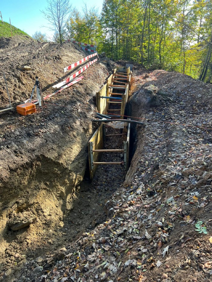 Erschliessung und Schutzmassnahmen: Leitungsführung im sensiblen Waldgebiet, Schutz bestehender Waldwege und temporäre Baupisten, Trassee-Erschliessung inkl. Geländesicherung.