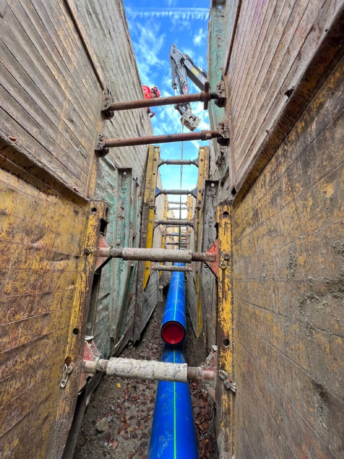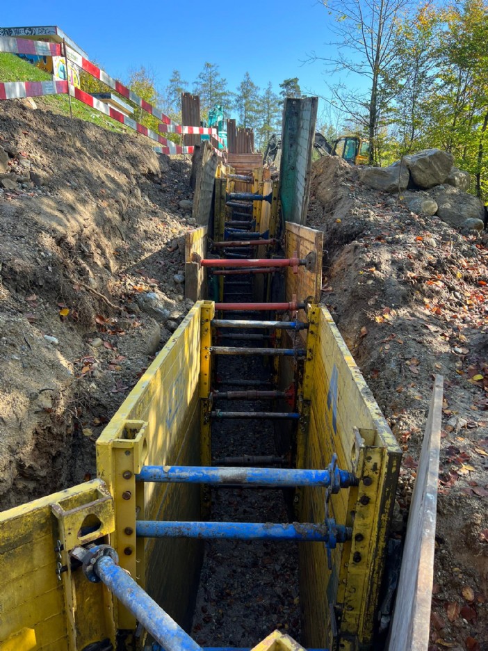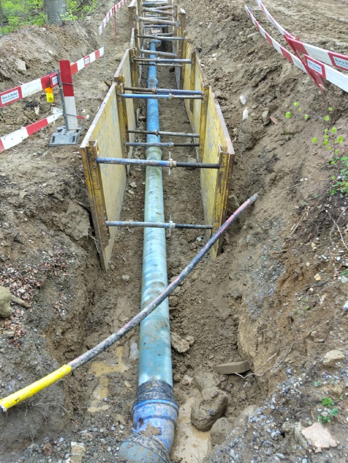 Neubau einer zweiten Einspeisung beim Hallenbad: Verbindung zur öffentlichen Leitung zur Steigerung der Redundanz.
