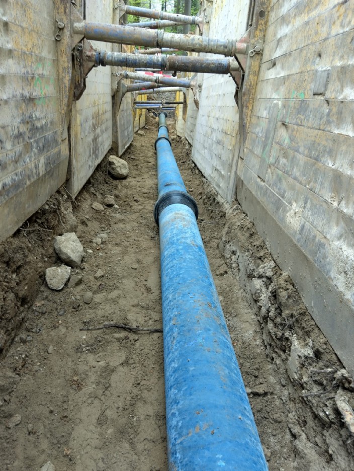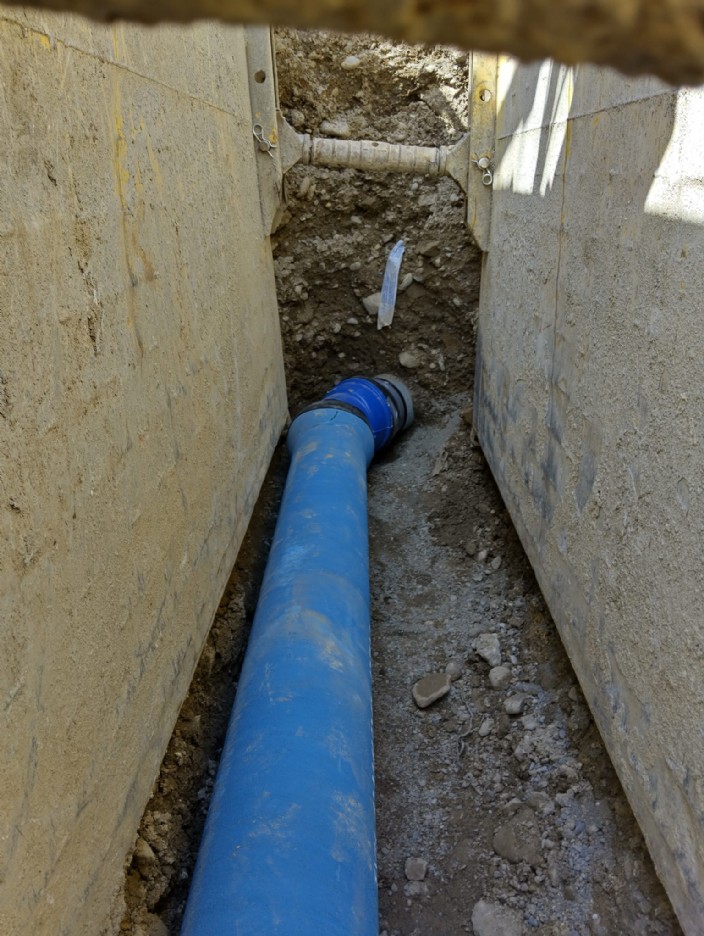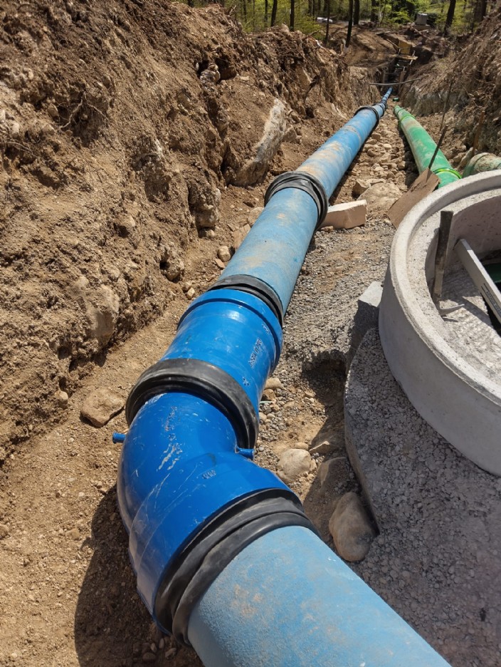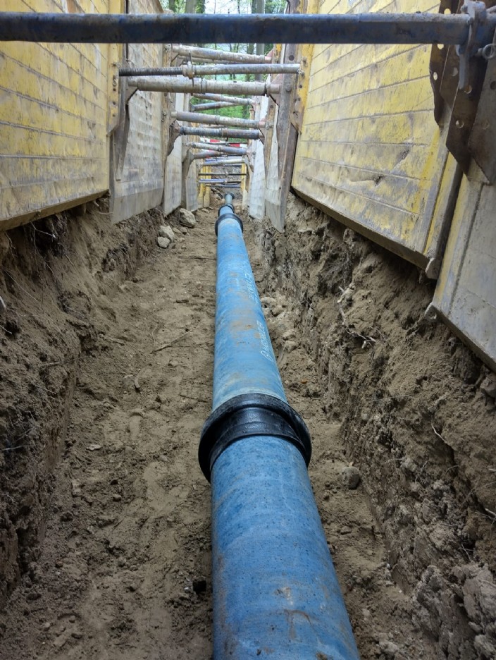 Rohrverlegearbeiten für die neue Reservoirableitung: Lieferung und Einbau von Hauptleitungen aus duktilem Guss, Druckhaltende Verbindung zur bestehenden Versorgungsinfrastruktur, Herstellung von Formstücken, Übergängen und Hausanschlüssen.