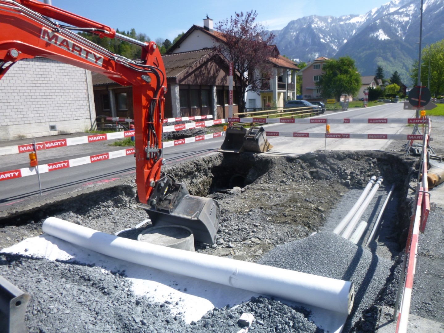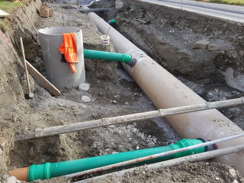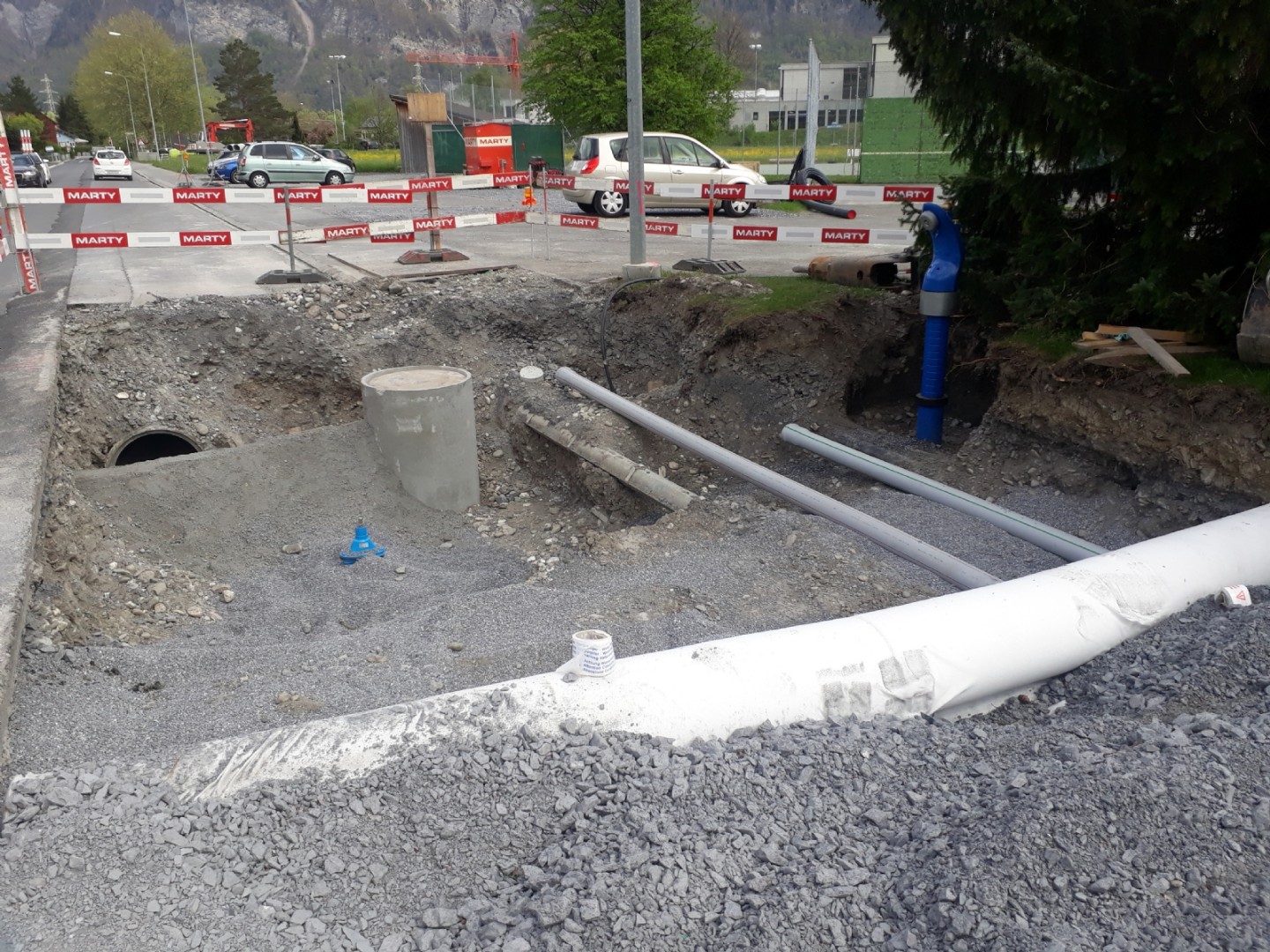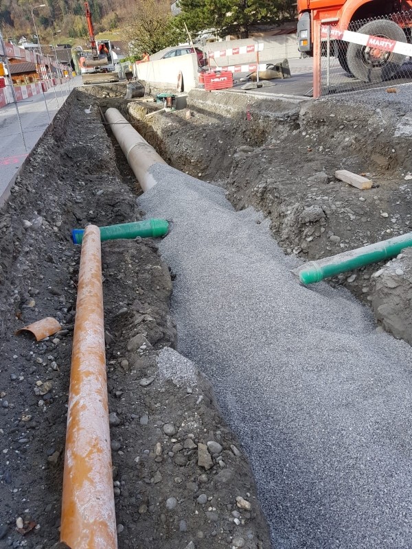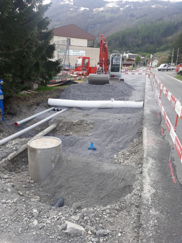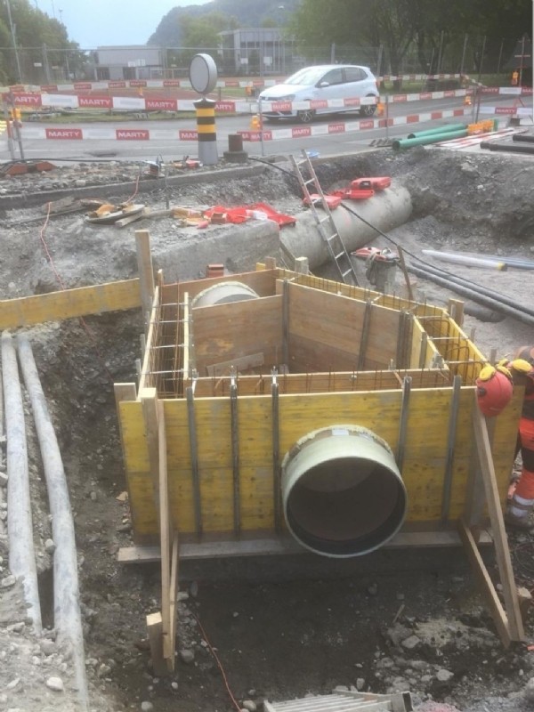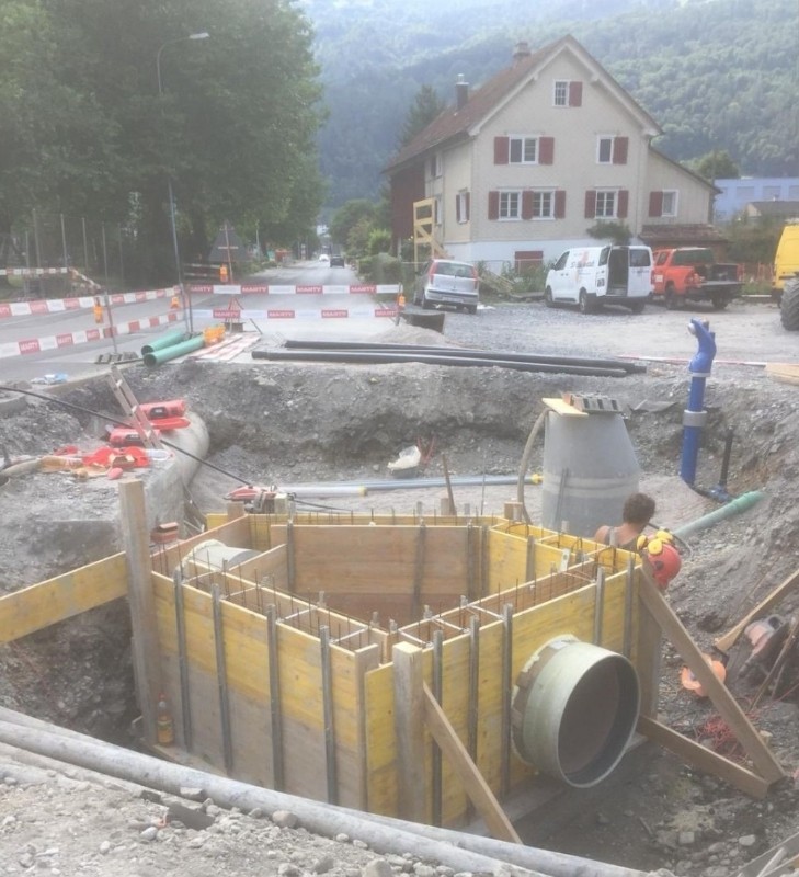 Unter Verkehrsbelastung und der Gewährleistung vom sicheren Zugang der zwei Schulhäuser, wurden an der Haupstrasse Sanierungsarbeiten von uns getätigt. Zudem wurden komplexe Ortbetonschächte erstellt.