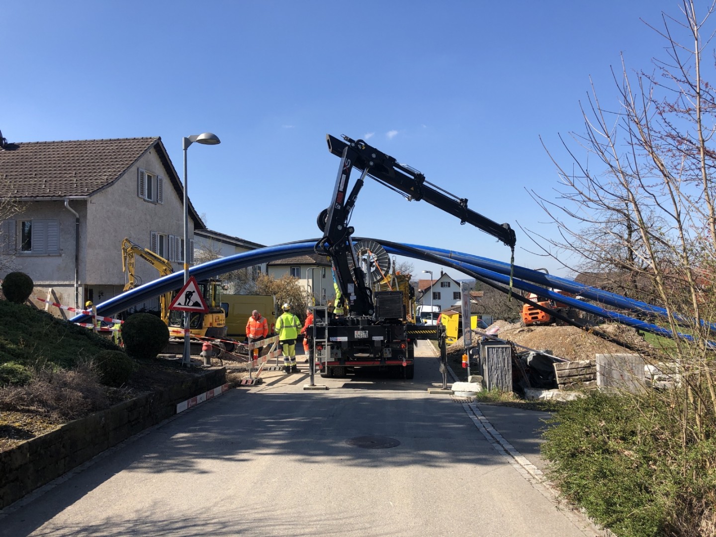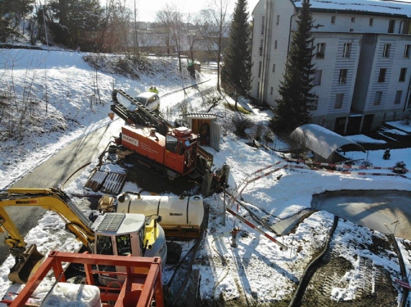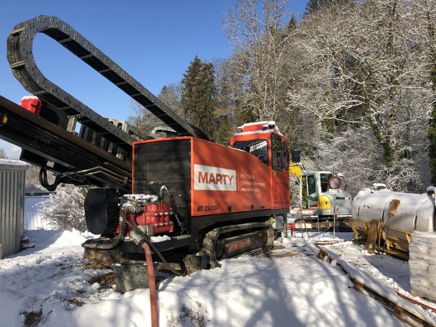 Um die Wasserversorgung im Gemeindegebiet auch zukünftig garantieren zu können, muss die bestehende Hauptwasserleitung saniert bzw. neu gebaut werden. Dabei wurde die Leitung durch das sehr steile Waldstück zwischen Kühweid und Trümlen, welches teil recht harten Nagelfluh afweist, mittels Horizontalspülbohrung verlegt.