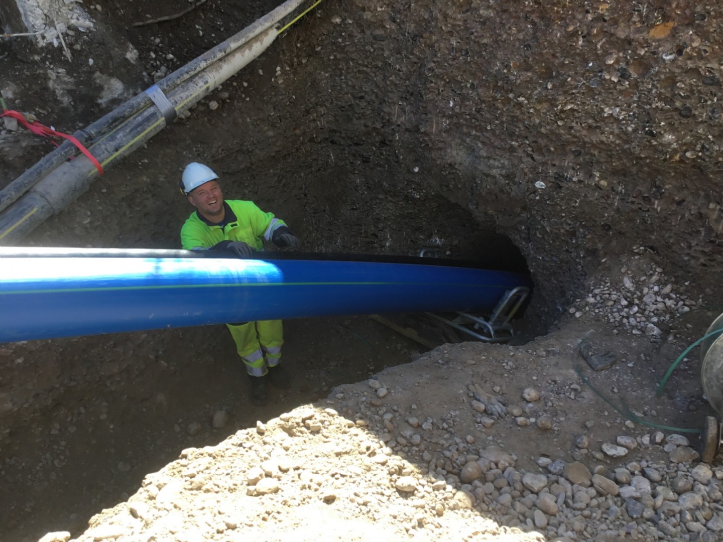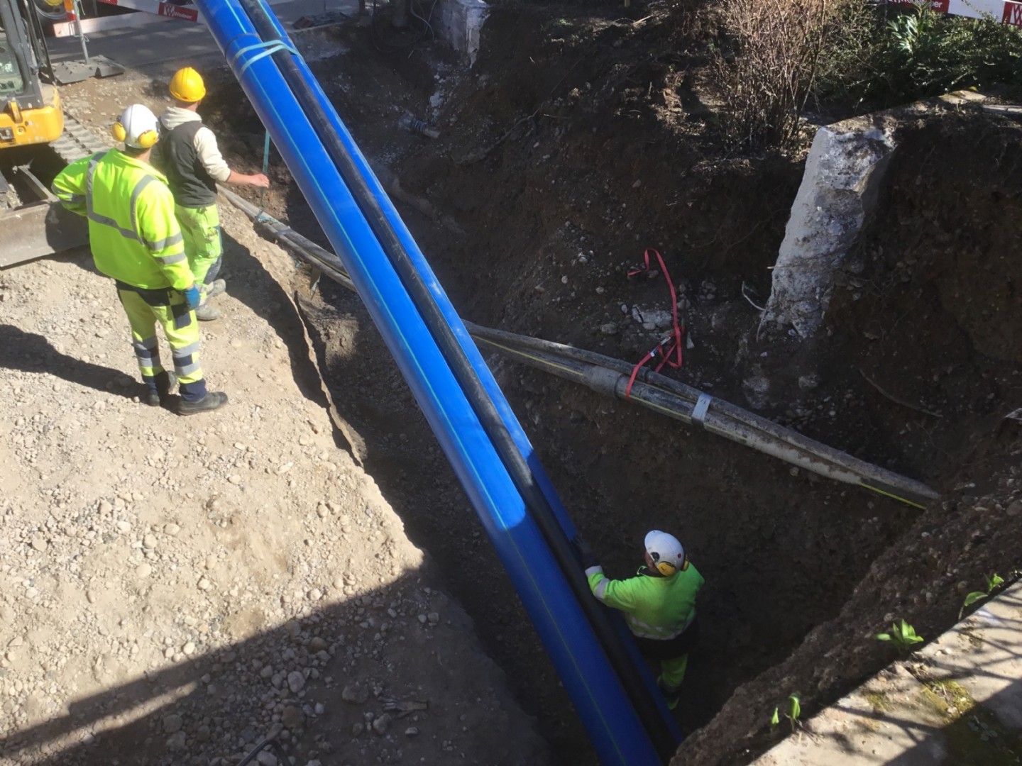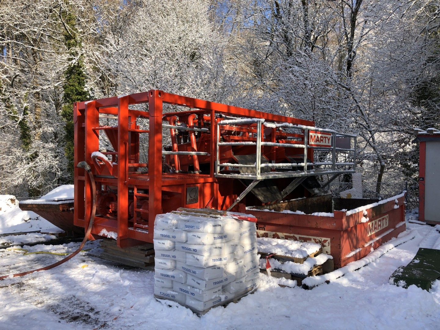 Um die Wasserversorgung im Gemeindegebiet auch zukünftig garantieren zu können, muss die bestehende Hauptwasserleitung saniert bzw. neu gebaut werden. Dabei wurde die Leitung durch das sehr steile Waldstück zwischen Kühweid und Trümlen, welches teil recht harten Nagelfluh afweist, mittels Horizontalspülbohrung verlegt.