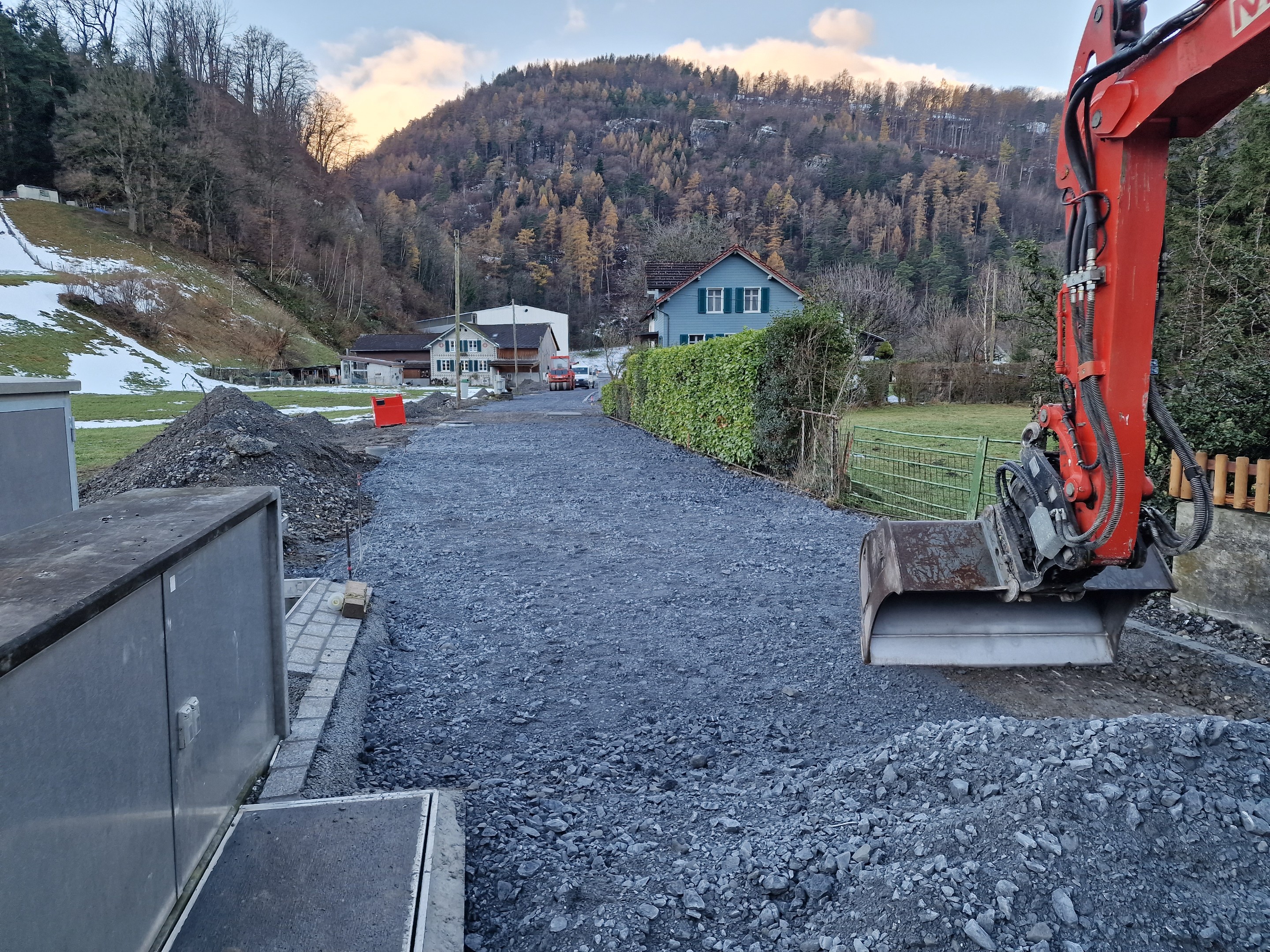 Tiefbau und Werkleitungen: Aushubarbeiten ca. 1’280m³, Fundationsschicht ca. 1'060m³, Neubau der Werkleitungen für Wasser, Elektrizität, Erdgas, Kommunikation und Entwässerung, Kanalisation ca. 65m.