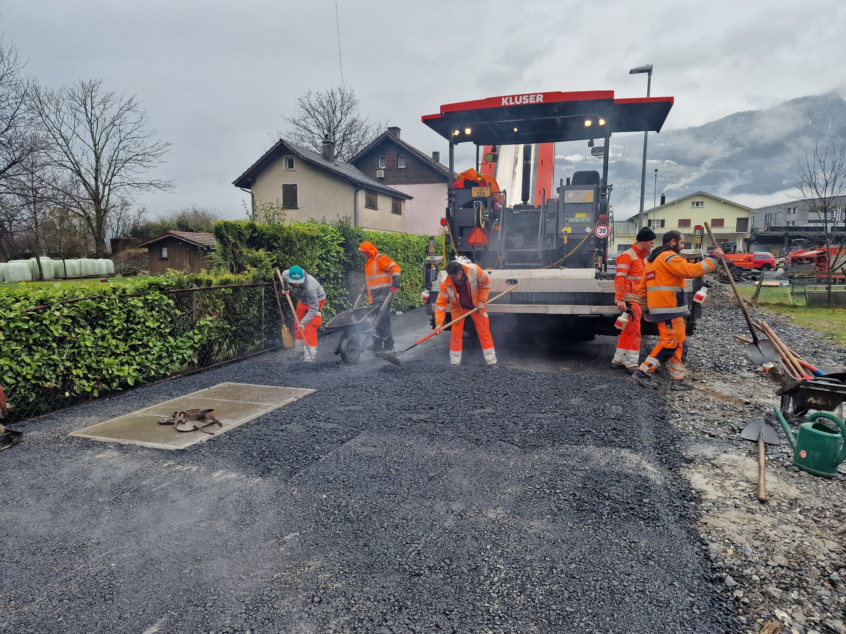 Strassenbau: Belagsaufbruch ca. 1'300m², Ausbau auf durchgehende Fahrbahnbreite von 4.70m, Neuer Strassenoberbau mit Asphaltbelägen (420to), Randabschlüsse auf 275m.