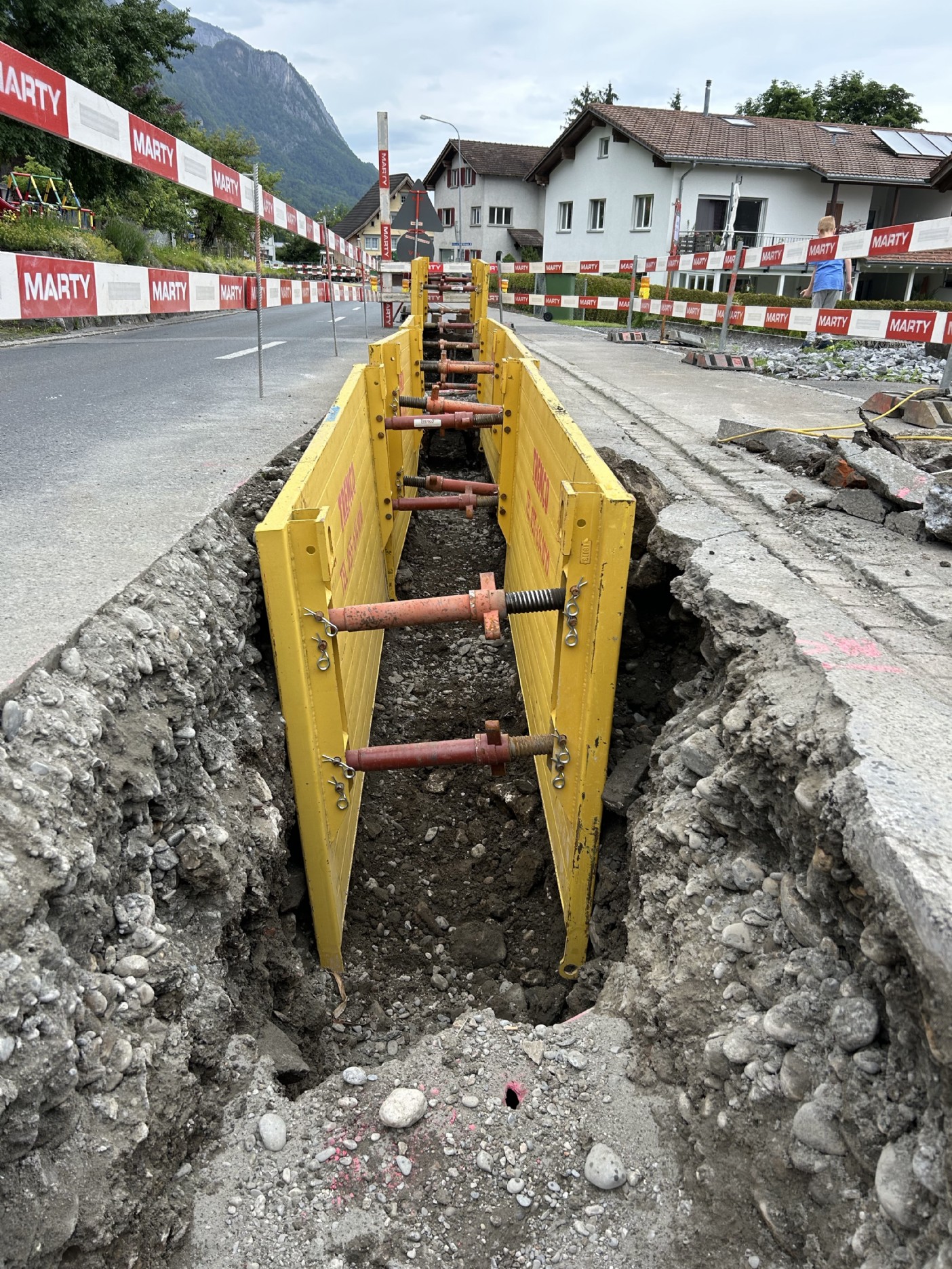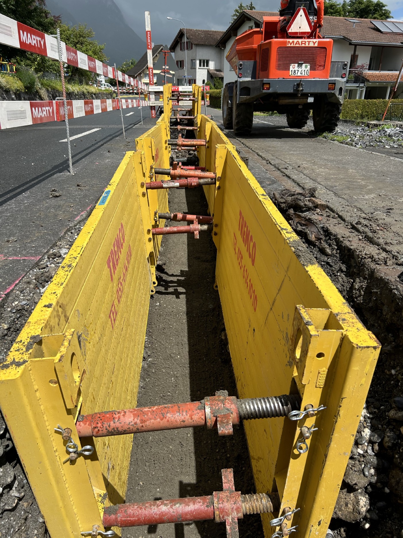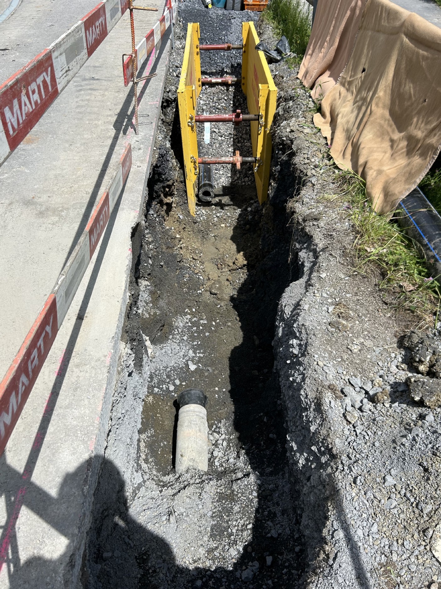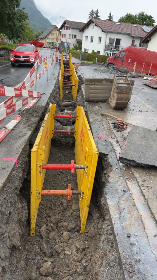 Der Kanton stellte die Auflage, dass der Graben mittels Kringselementen auf einer Länge von ca. 150m gespriesst werden musste. Die erfolgte in Etappen von ca. 25m und der Verkehr wurde mittels Lichtsignal geregelt.