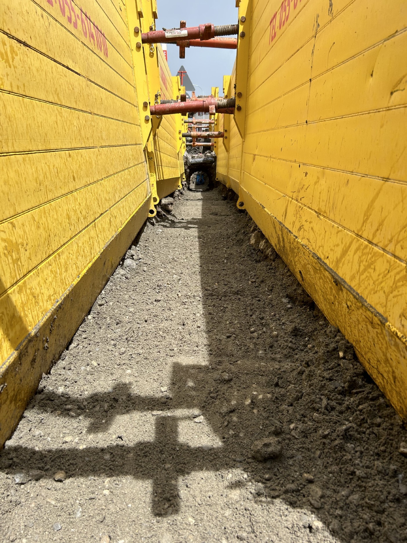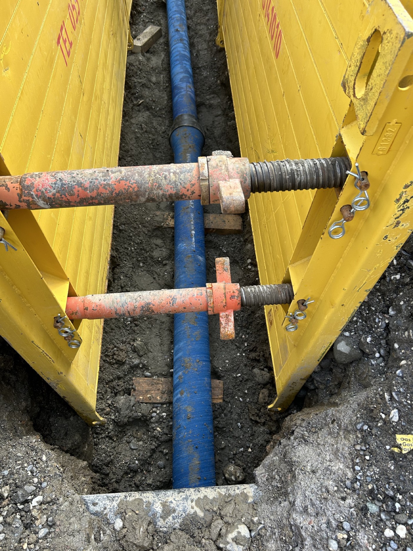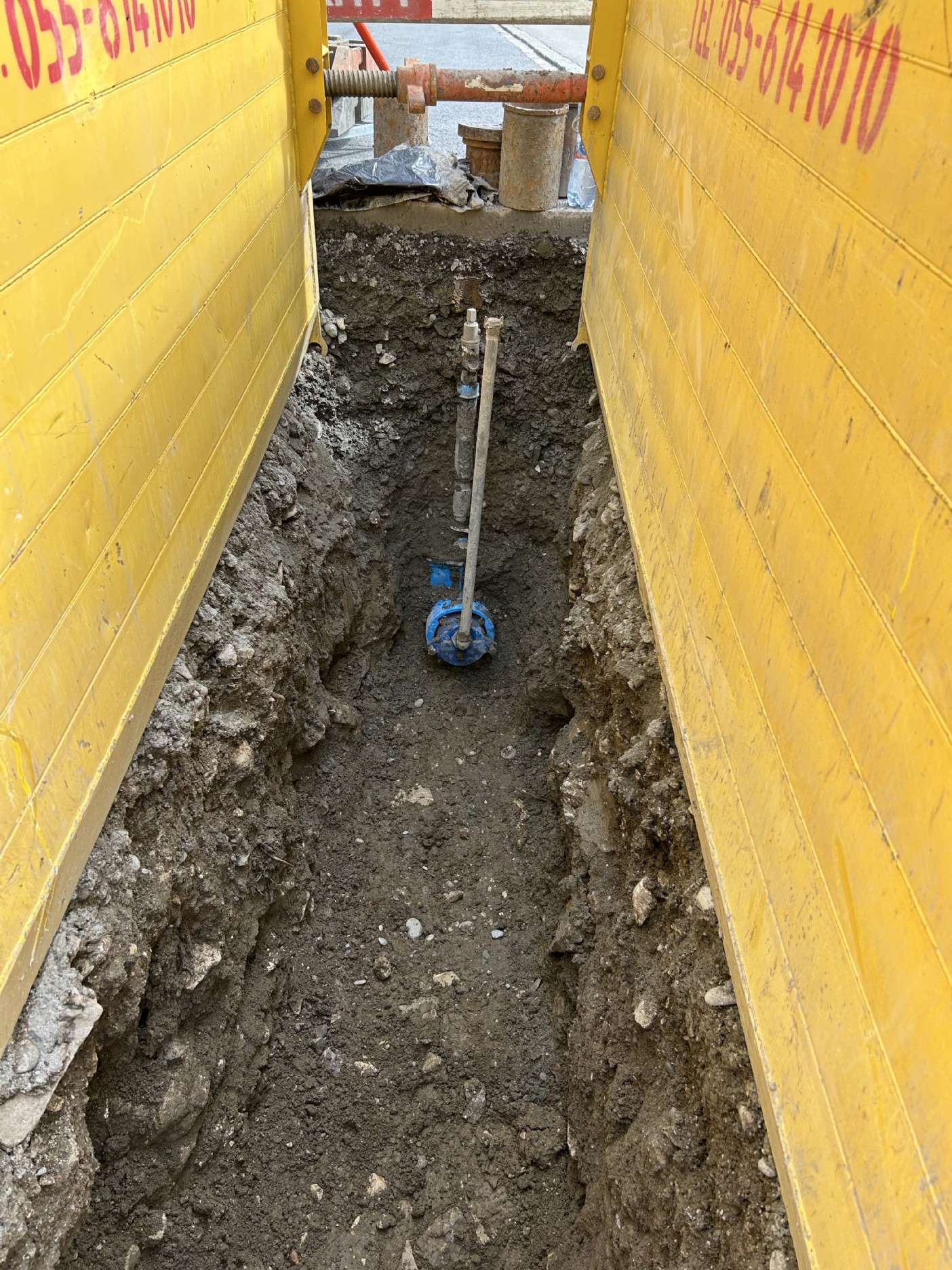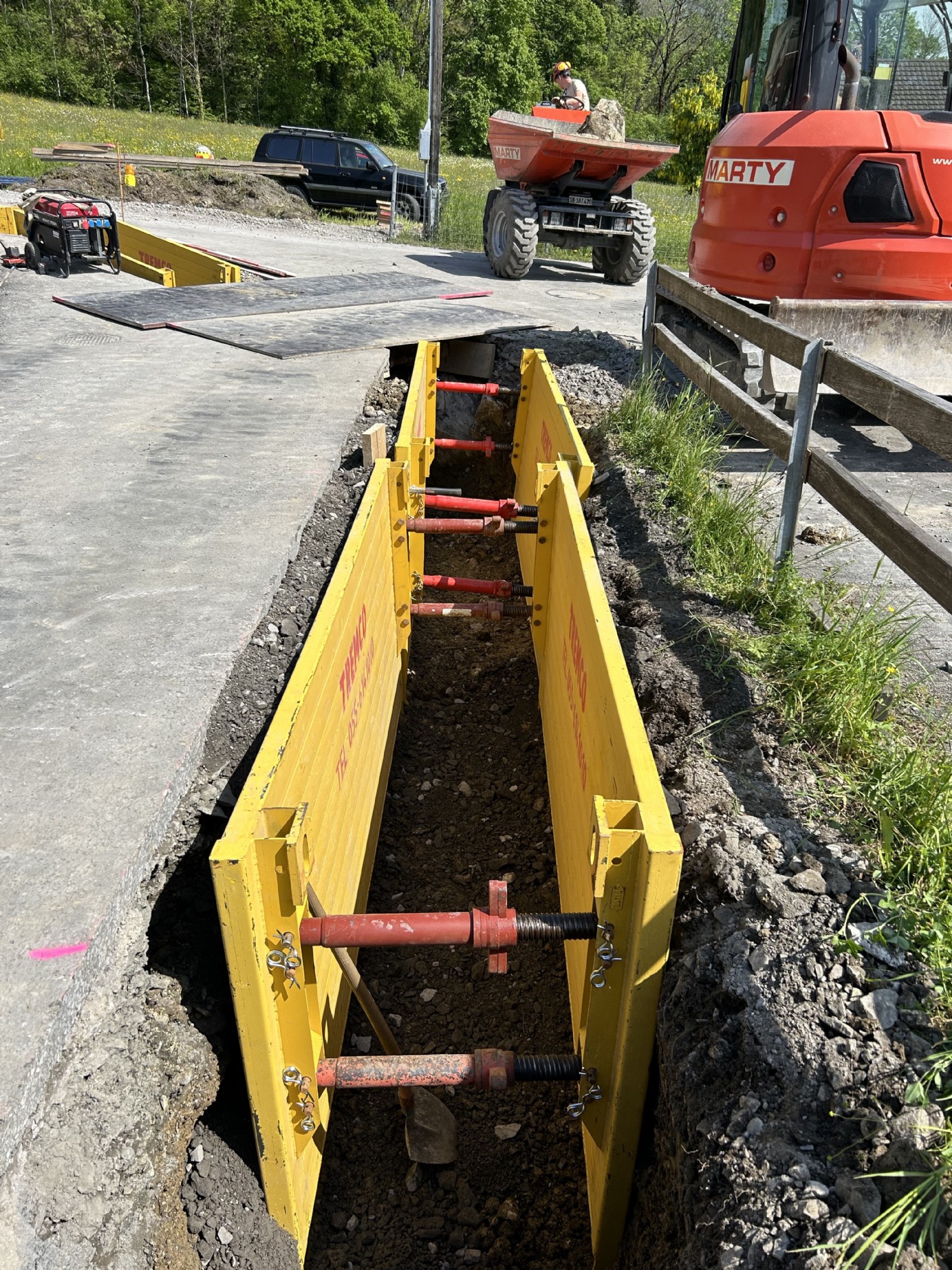 Der Kanton stellte die Auflage, dass der Graben mittels Kringselementen auf einer Länge von ca. 150m gespriesst werden musste. Die erfolgte in Etappen von ca. 25m und der Verkehr wurde mittels Lichtsignal geregelt.